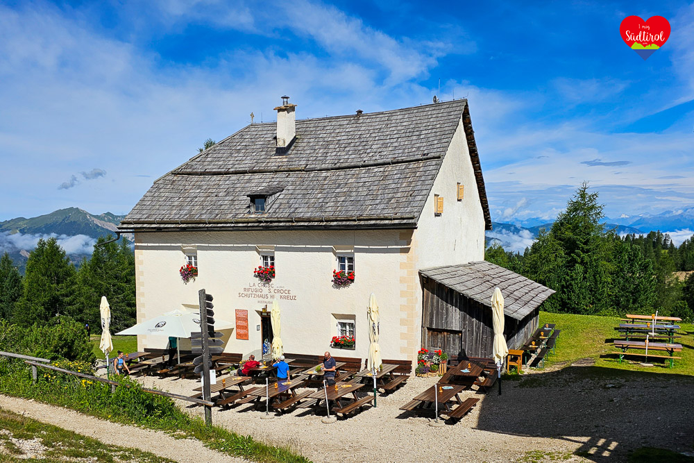 Die Wanderung beginnt am Parkplatz Furnacia und führt durch die Armentara Wiesen, vorbei an Almwiesen und Bergblumen, bis zur Heilig-Kreuz-Kirche unter dem Heilig Kreuz Kofel. Neben der Kirche lädt das Schutzhaus Heiligkreuz zu einer Pause ein, bevor der Rückweg zum Ausgangspunkt erfolgt, begleitet von Panoramablicken auf die umliegende Berglandschaft.