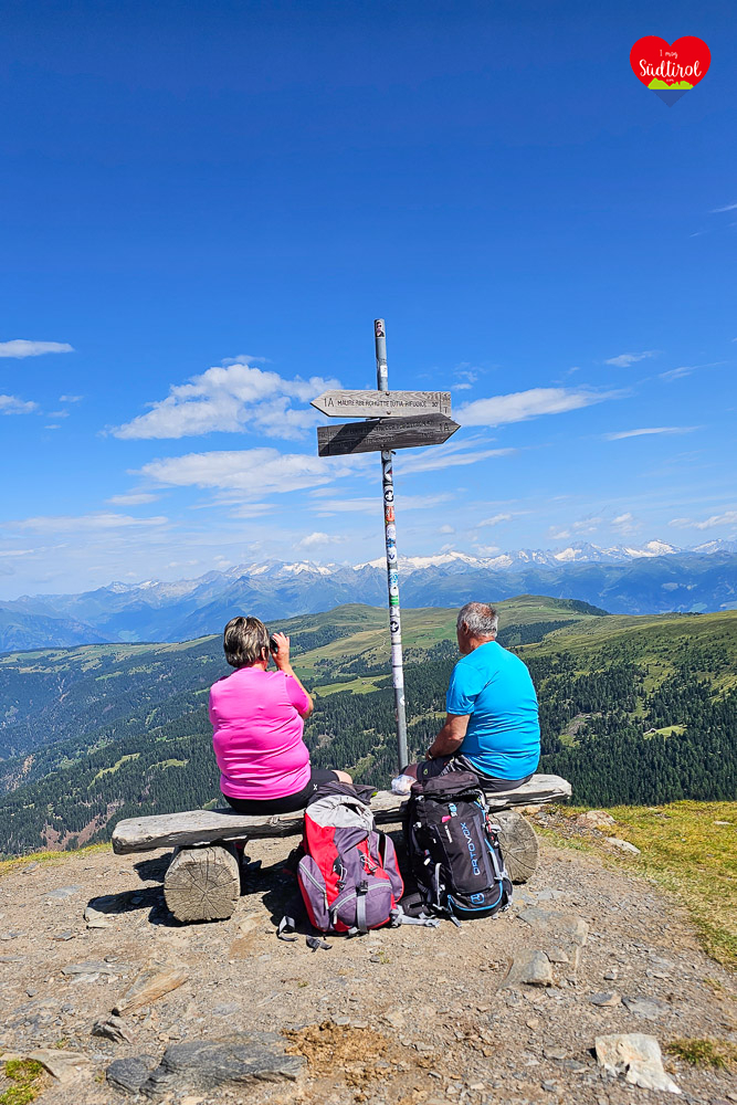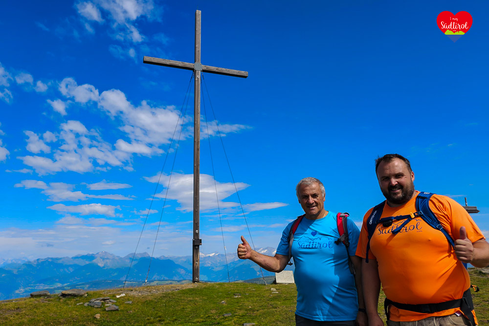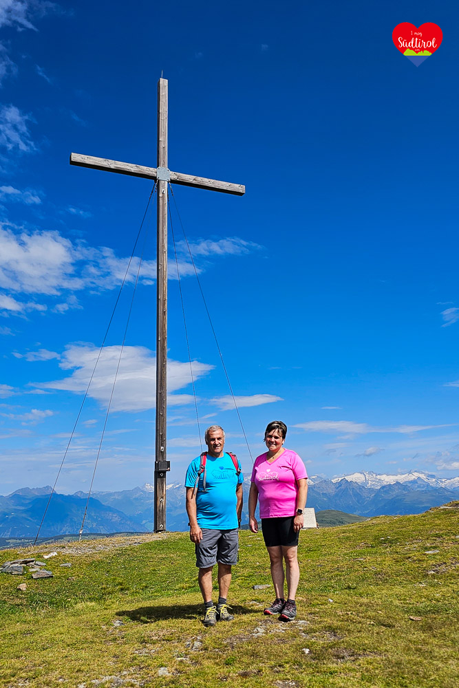 Gut gestärkt machten wir uns auf den Weg, die 45 Minuten Wanderung zum Gipfelkreuz des Maurerbergs auf 2.326 m Höhe in Angriff zu nehmen. Der Pfad führte uns über etwa 2 km und 200 Höhenmeter durch malerische Almwiesen, wo Kühe friedlich grasten. Mit jedem Schritt genossen wir den traumhaften Ausblick, bis wir schließlich das Gipfelkreuz erreichten. Oben angekommen, wurden wir mit einem beeindruckenden 360-Grad-Panoramablick belohnt: die majestätischen Dolomitengipfel, die Rieserferner, die Pfunderer Berge und viele weitere Schönheiten der Alpen begeisterten uns zutiefst. Nach einer erholsamen Pause am Gipfel machten wir uns auf den Rückweg und wanderten denselben Weg zurück zum Auto