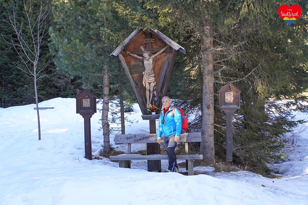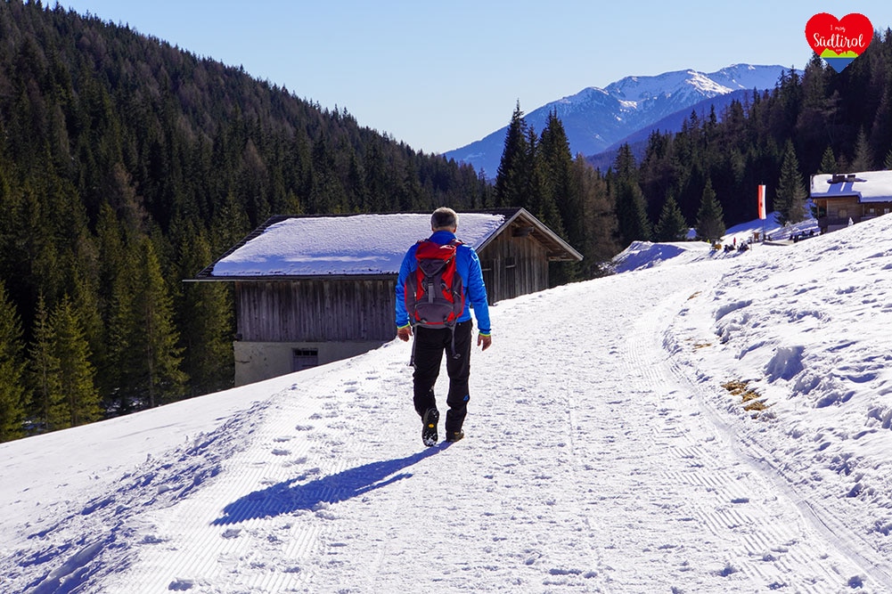 Auch im Winter kann man ins Altfasstal über einen präparierten Winterwanderweg wandern. Der Winterwanderweg ist ein Rundweg wobei man ein Teilstück des Tals durchwandern und die herrliche Winterlandschaft genießen kann. Auch eine Almhütte, die Großberghütte ist im Winter bewirtschaftet und lockt mit schmackhaften Südtiroler Gerichten wie hausgemachte Südtiroler Knödel oder Kuchen herzlich an.