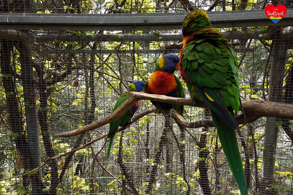 Wir gingen noch in den Garten der Verliebten und danach zum höchsten Punkt der Gärten und besichtigten die Vogelvoliere mit Papageien und Loris. Bevor wir durch die Reisfelder und japanischen Gärten zum Parkplatz zurückkehrten, saßen wir auf der Terrasse des Restaurants Trauttmansdorff und genossen den Eisbecher Sissi mit schönem Blick in die Gartenanlage.