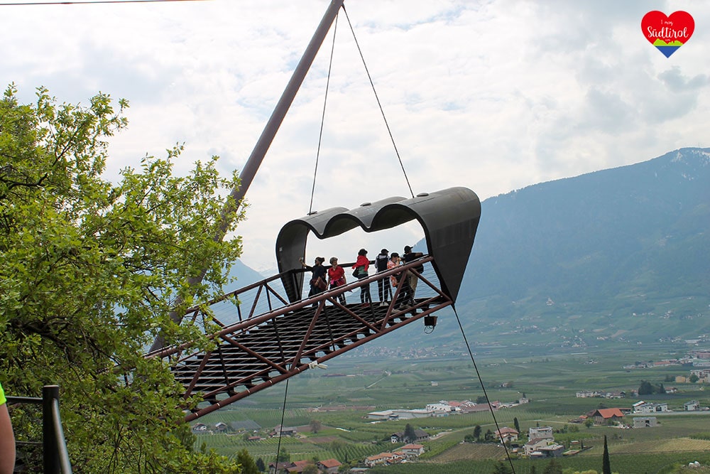 Wir machten es uns auf den Liegestühlen gemütlich, die in der Mitte des Teichs sind, beobachteten die Fische und genossen das Flair des Gartens. Nach einer Weile wagten wir den Aufstieg zum Thun´schen Gucker, benannt nach dem Südtiroler Architekten und Designer Matteo Thun.