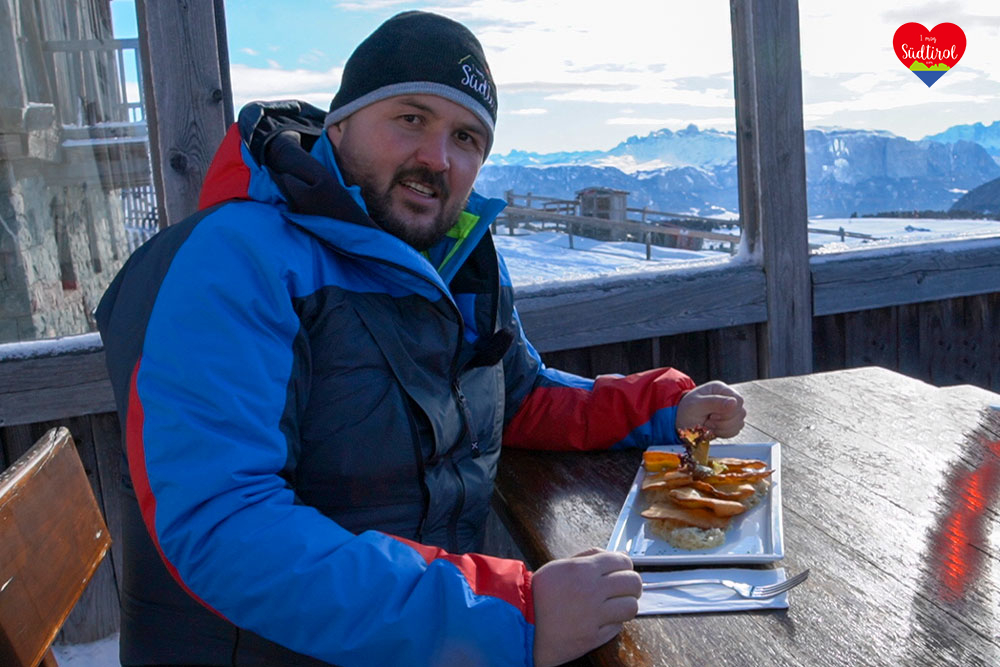 Bei unserer Ankunft auf der Stöfflhütte wurden wir überaus herzlich willkommen geheißen. Zur Stärkung genossen wir ein exzellentes Mahl, bestehend aus „Plattlan mit Sauerkraut“, einer traditionellen Spezialität Südtirols. Wir verbrachten entspannte Momente auf der wunderschönen Sonnenterrasse, umgeben von einer gemütlichen Atmosphäre und einer atemberaubenden Aussicht auf die Gipfel der Dolomiten, darunter Langkofel und Plattkofel, die Geislerspitzen, den Schlern, den Sellastock, die Marmolada, den Peitlerkofel sowie die Plose, bekannt als Skiberg. Wir hielten diesen Moment in zahlreichen Fotos und Videos fest. Ein besonderes Highlight war, als mein Vater die Ziehharmonika des Hüttenwirts in die Hand nahm und ein fröhliches Ständchen zum Besten gab.
