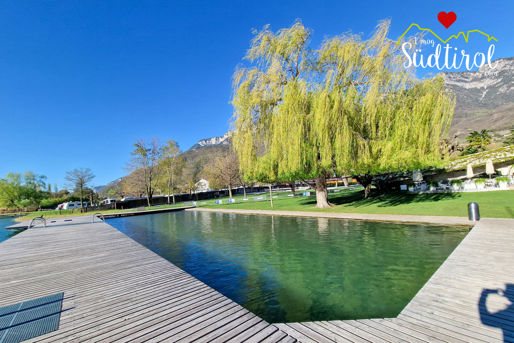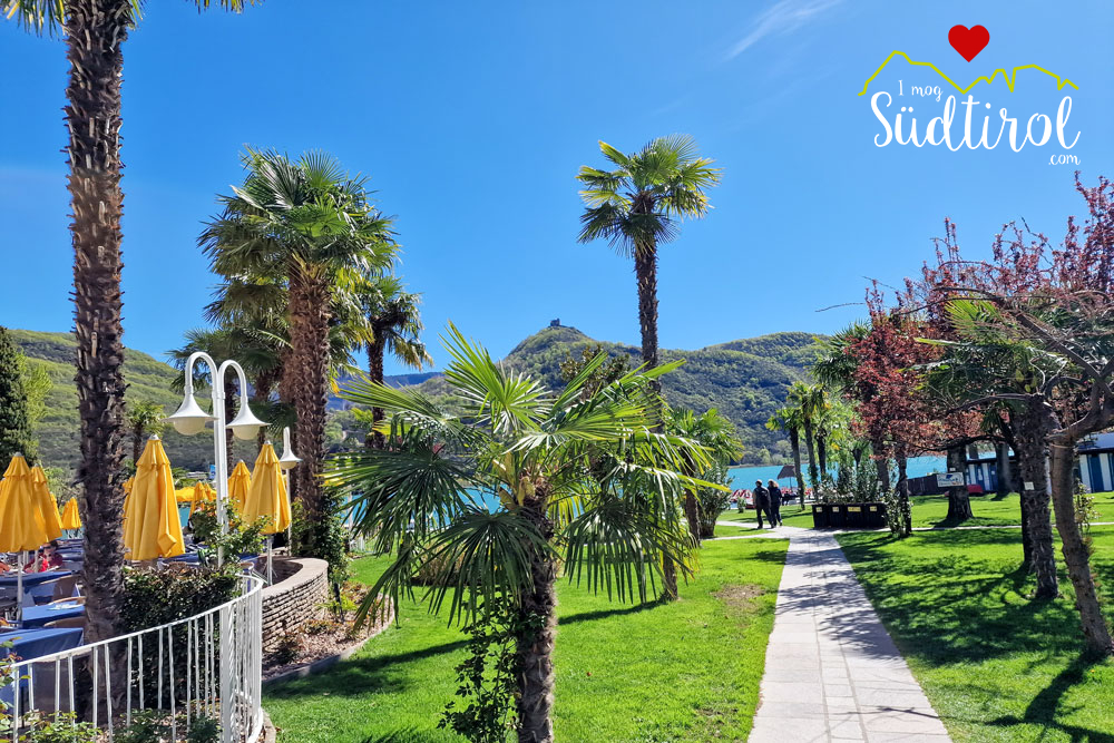Vom Aussichtspunkt aus setzen wir unsere Wanderung fort und passieren das Parc Hotel Am See. Von dort aus genossen wir erneut den wunderschönen Blick auf den Kalterer See sowie auf den imposanten Penegal, der majestätisch über der Landschaft thronte. Unsere Route führte uns weiter durch Apfelplantagen und malerische Rebanlagen, die die Umgebung prägten. Auf unserem Weg kamen wir am Restaurant Pizzeria Geier vorbei und schließlich erreichten wir das Lido am See, ein öffentliches Schwimmbad direkt am Ufer des Kalterer Sees.