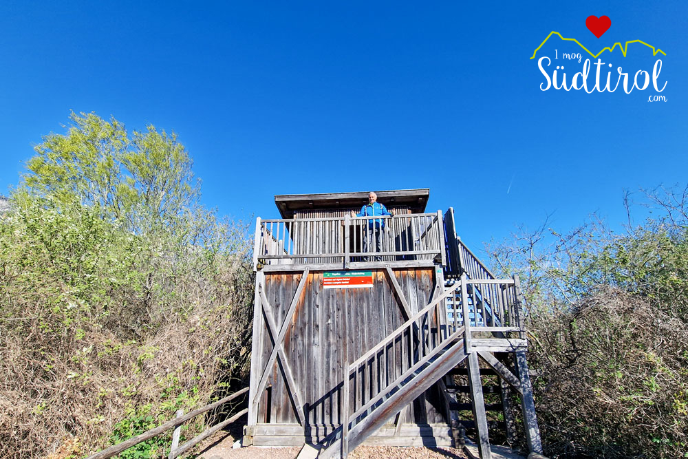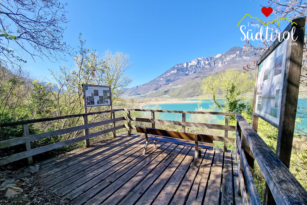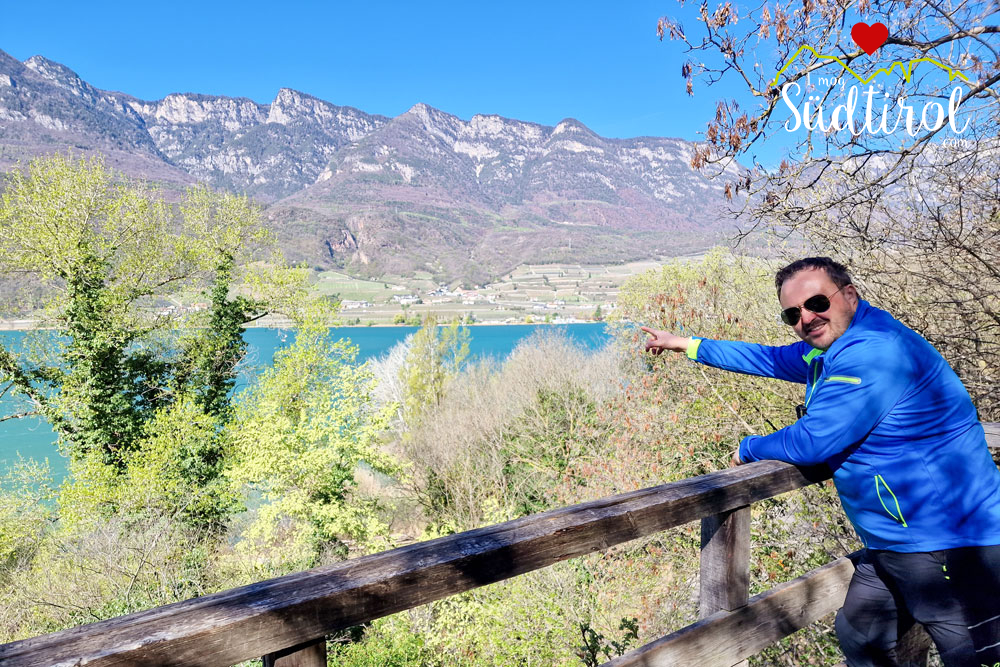 Nach dem Durchqueren des Biotops erreichten wir die Aussichtsplattform Kuchelweg, von der aus wir einen herrlichen Blick auf die Umgebung hatten. Auf unserem weiteren Weg kamen wir am Auwald des Kalterer Sees vorbei und erreichten schließlich die Straße oberhalb des Sees. Wir folgten dem Wanderweg und gelangten schließlich zu einem Aussichtspunkt mit einer atemberaubenden Aussicht auf den See.
