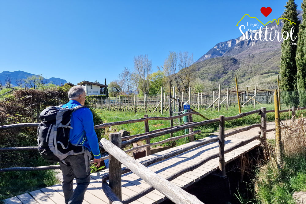 Unser Weg führte uns weiter entlang der Route, vorbei an Wohnhäusern und der Residence Roland. Wir passieren auch die St. Josef Kirche und den Camping St. Josef am Kalterer See. Zwischen den malerischen Apfelbäumen setzen wir unsere Wanderung fort. Der Weg führte uns zum Biotop, wo wir über einen Holzsteg durch das natürliche Feuchtgebiet wanderten. Dabei begleiteten uns die fröhlichen Gesänge der Vögel, die in der Umgebung leben.