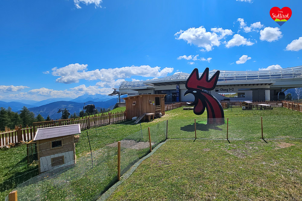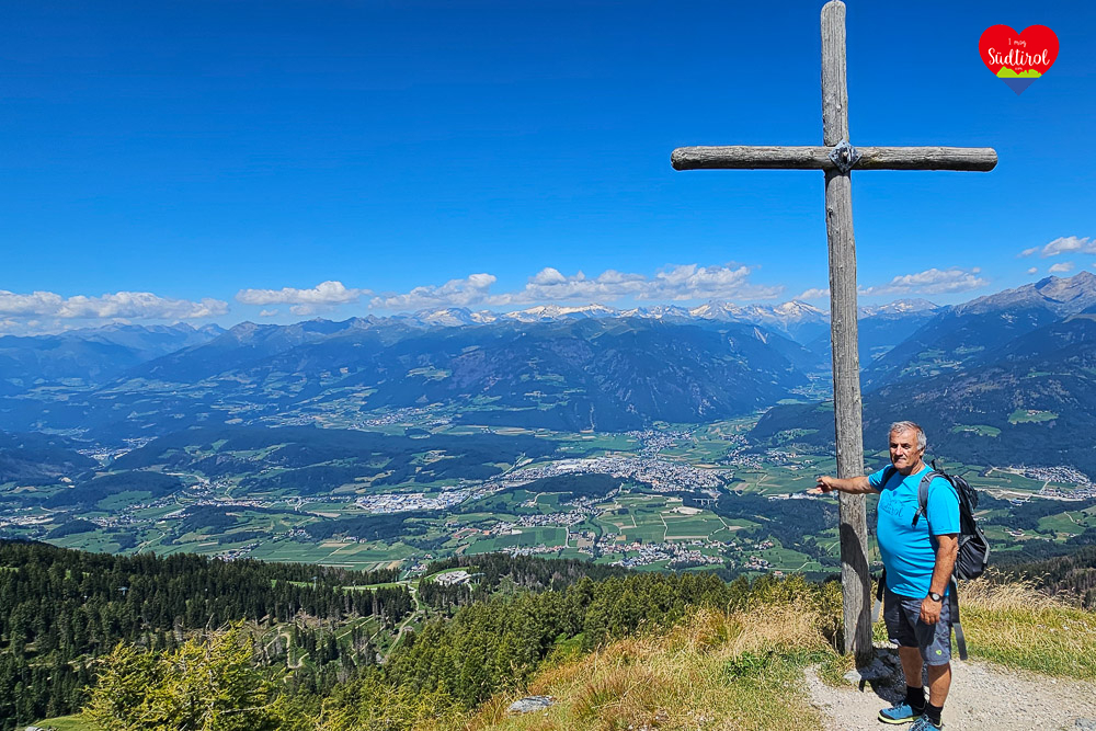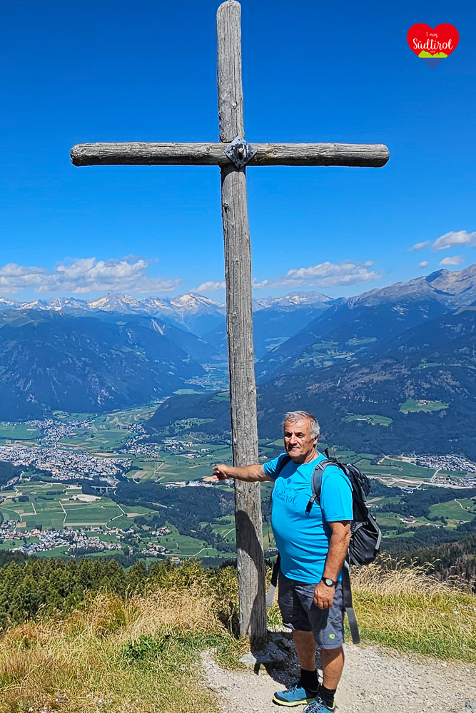Nach einer guten Stärkung in der Graziani Hütte setzen wir unsere Wanderung auf dem Panoramarundweg fort. Der schmale Pfad führte uns durch saftige Almwiesen, vorbei an grasenden Kühen, bis zur Mittelstation der Olang Bahn, wo uns ein kleiner Tierpark erwartete. Immer wieder laden verschiedene Rastplätze dazu ein, das beeindruckende Panorama zu genießen. Der Weg stieg nun leicht an, vorbei an der „Schoflocke“ und verschiedenen Kunstwerken, bis wir ein weiteres schönes Gipfelkreuz erreichten. Von dort hatten wir eine traumhafte Aussicht auf das untere Pustertal, Bruneck, das Ahrntal, die Pfunderer Berge, das Rieserferner und vieles mehr. Nach einer kurzen Rast setzten wir unsere Wanderung fort. Es war nicht mehr weit bis zum Ende des „Artis Rundwegs“, der von uns aus die Forststraße hinauf zur CAI Hütte führte.