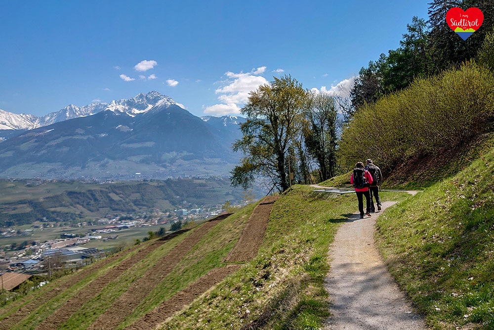 Es gibt auch eine mittelschwere Rundwanderung am Marlinger Berg. In der Töll kann man den Meraner Höhenweg erwandern. Es geht vorbei an den Holzmairhöfen zum Gasthof Tschigg und weiter zum Restaurant Waalheim. Von hier aus kann man über den Waalweg zurück zum Parkplatz schlendern.