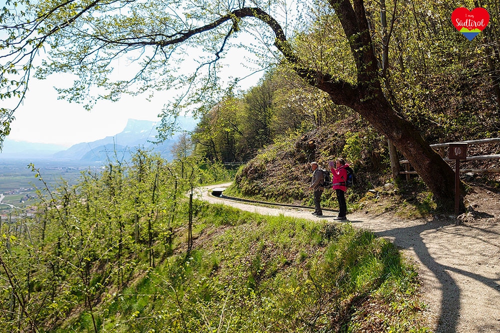 Nach einer Pause der Erholung und Entspannung wanderten wir weiter. Oberhalb von Tscherms vorbei, genossen wir den Rundumblick auf die umliegenden Dörfer und Weindörfer, die herrlichen Obstanlagen und natürlich auf Lana, dass unser Ziel war. Immer wieder drehten wir uns um und blickten zur Kurstadt Meran zurück. Gleichzeitig erblickten wir bereits die Bergbahn von Oberlana nach Vigljoch und wir wussten uns Ziel ist nicht mehr weit weg.