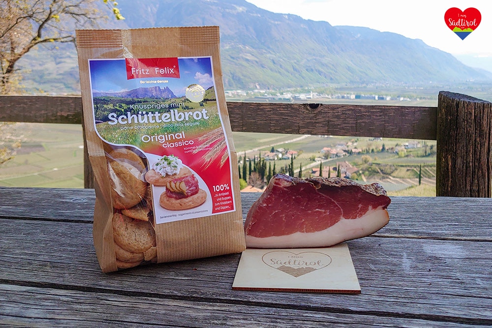 Da unser Weg weiter nach Tscherms führte, gingen wir bei Marling nicht hinab zum Dorf sondern wanderten entlang des Waalweges weiter. Es war einfach herrlich! Das Wasser, das neben uns plätscherte, sorgte für eine beruhigende Atmosphäre und schenkte uns ein wohltuendes Gefühl. Wir wanderten an mehreren Einkehrmöglichkeiten vorbei. Nach einiger Zeit kamen wir zu einer Stelle, wo ein schönes Wetterkreuz stand. Es animierte uns ein Foto zu machen. Als wir am Kreuz standen und die herrliche Aussicht genossen, sahen wir unterhalb des Kreuzes einen schönen Tisch mit einer Bank. Genau dort setzten wir uns nieder und stärken uns mit mitgebrachtem Südtiroler Speck und Schüttelbrot.