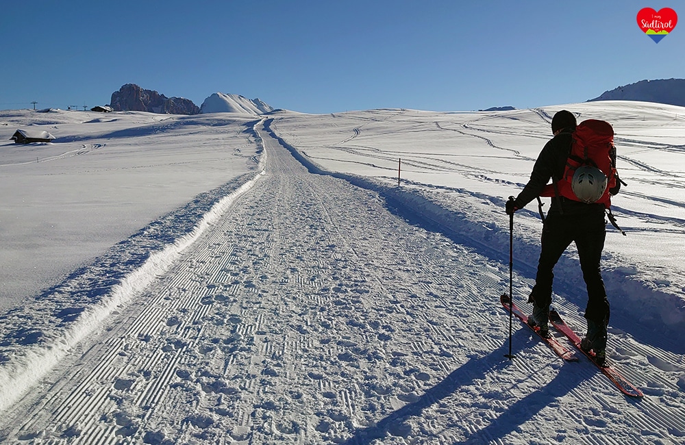 An einem sonnigen Tag im Winter sind mein Freund Armin und ich auf die Seiseralm gefahren. Wir waren zeitlich früh dran, sodass wir mit dem Auto bis auf dem Parkplatz in Compatsch fahren durften. Ab 9:00 Uhr ist nämlich die Straße für den Verkehr gesperrt. Am Parkplatz in Compatsch angekommen (Parkplatzgebühren) bereiteten wir uns für den Ausflug vor. Armin hatte jedoch keine Ausrüstung dabei. Wir gingen zu Sport Hans, der Armin mit einer Tourenausrüstung bestens ausstattete. Nach kurzer Einschulung starteten wir los.