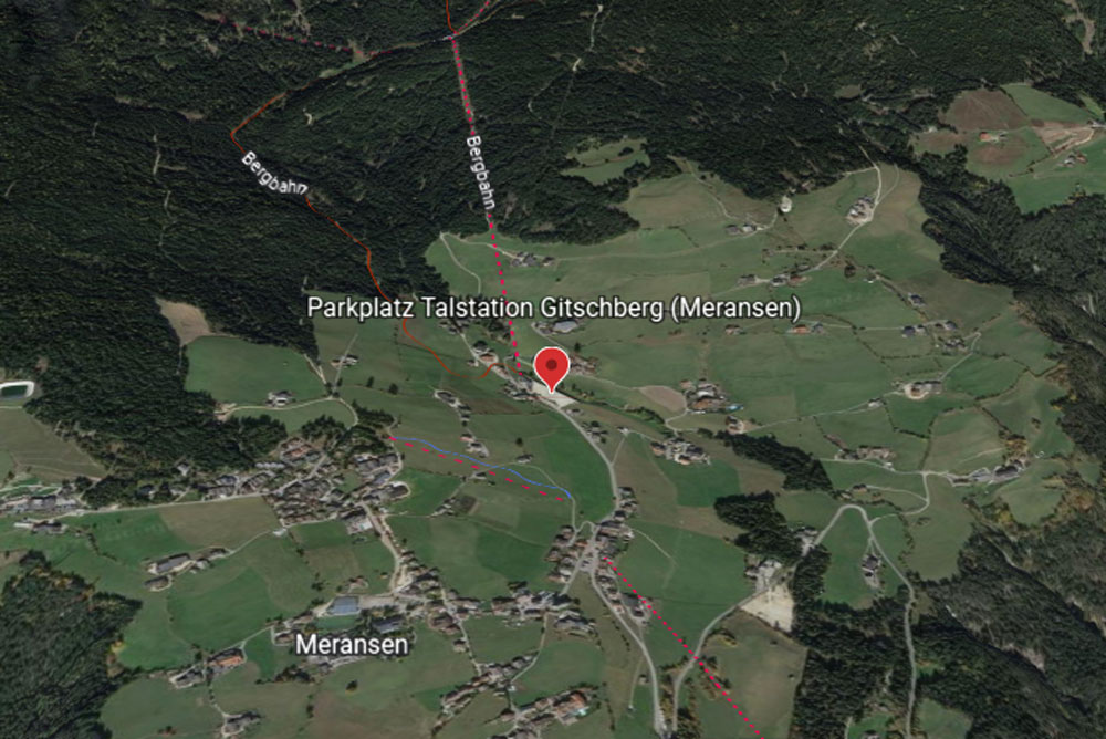 AUTO: Sie fahren nach Mühlbach, am Eingang des Pustertales dort zweigen Sie ab und folgen der Beschilderung Meransen. Weiter führt Sie die Lindenstraße (SC110) bis nach Meransen. Im Dorf angekommen halten Sie sich rechts und folgen weiter der (SC110) bis zur Talstation der Gitschbergbahn. Dort parken Sie ihr Auto