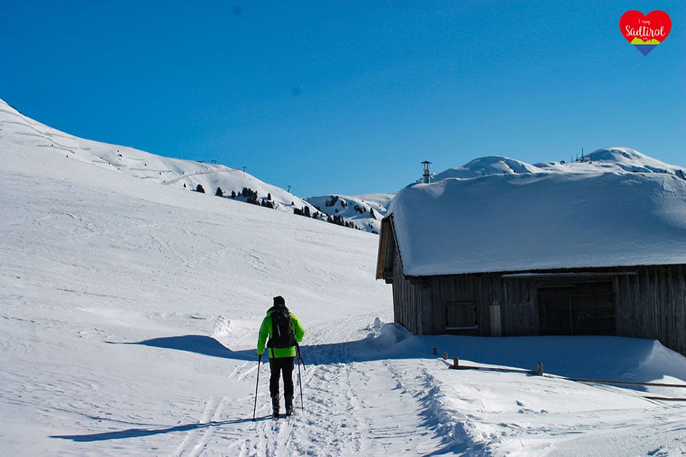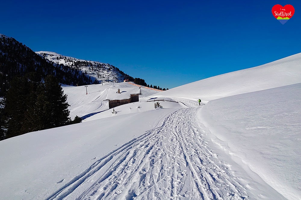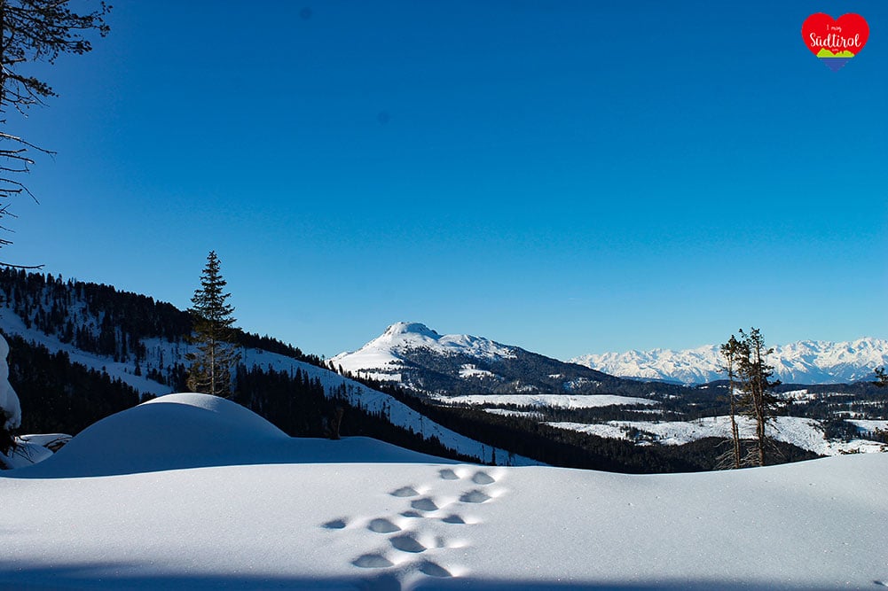 Hier in Obereggen, im Eggental, im UNESCO Welterbe Dolomiten, in Südtirol ist das Wandern, das Spazieren über die verschneiten, schneeweißen Wiesen in Ruhe und Stille möglich.