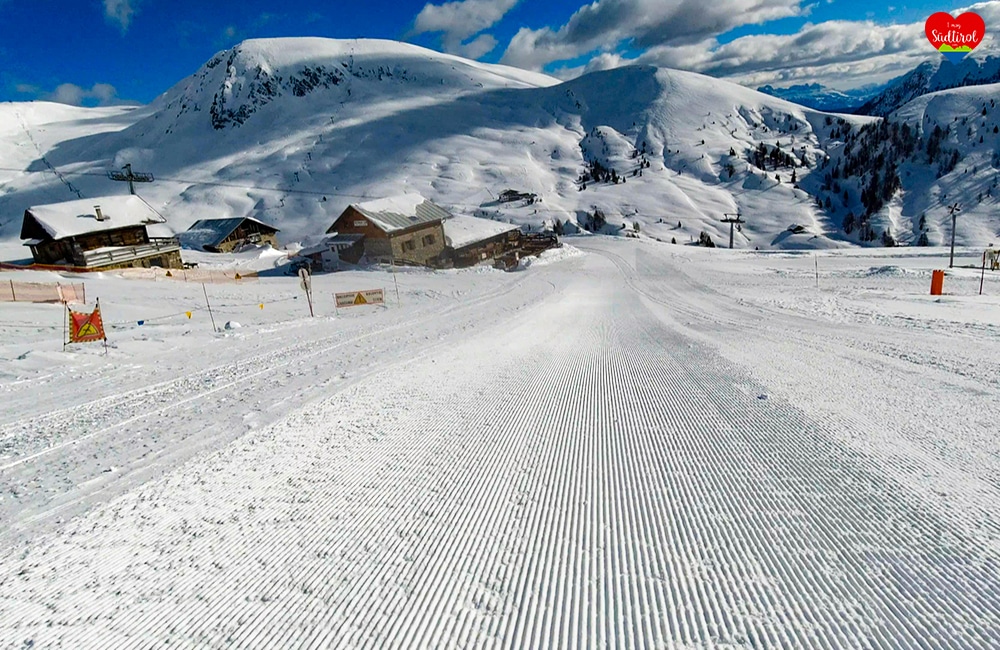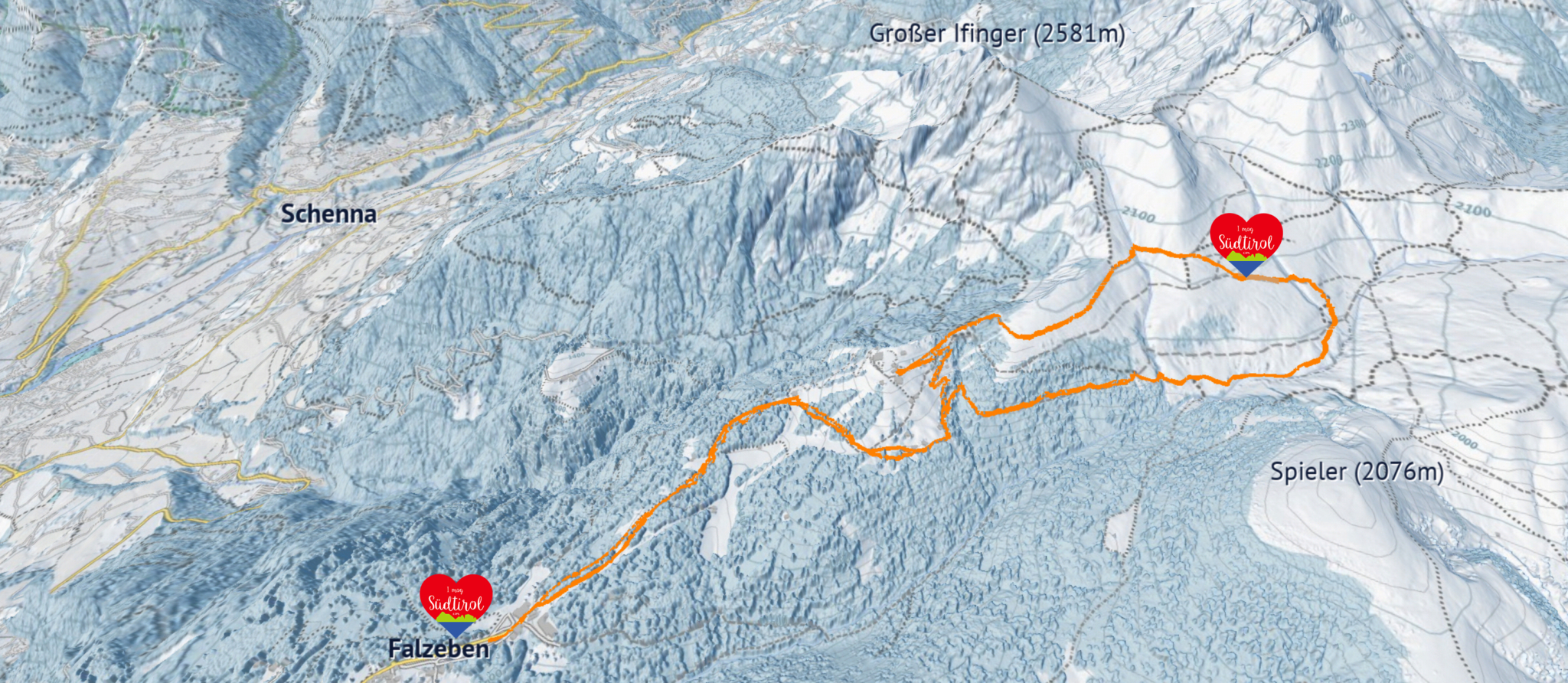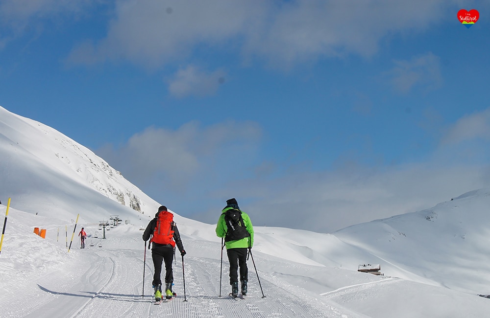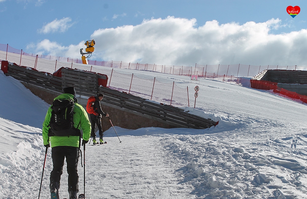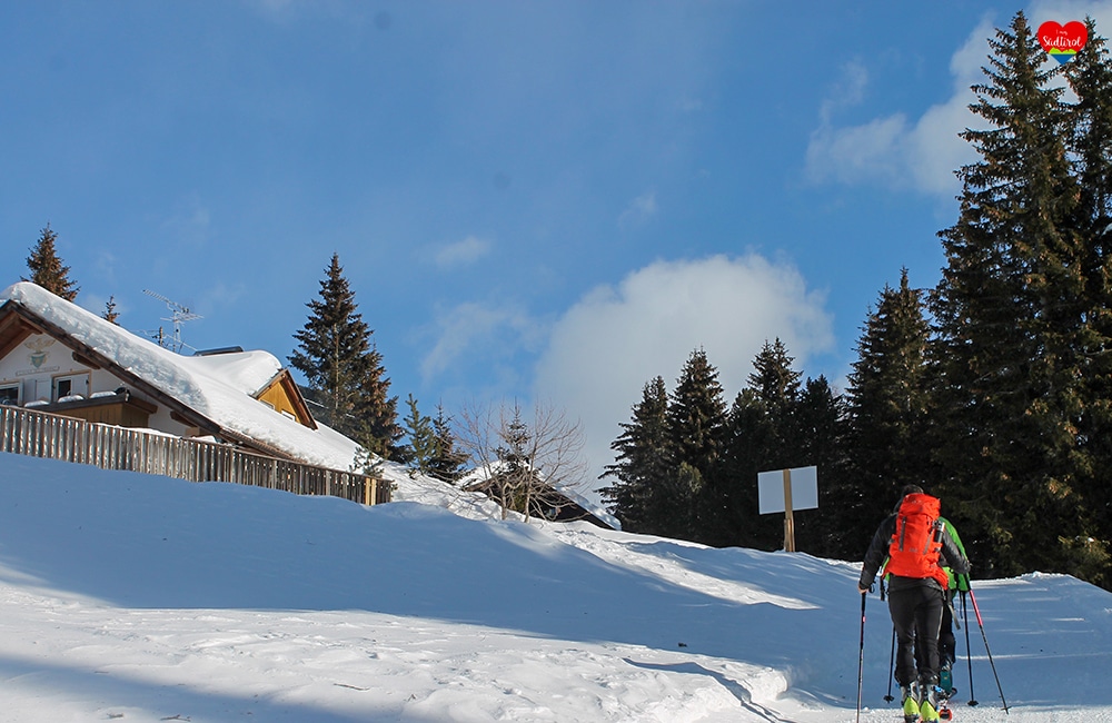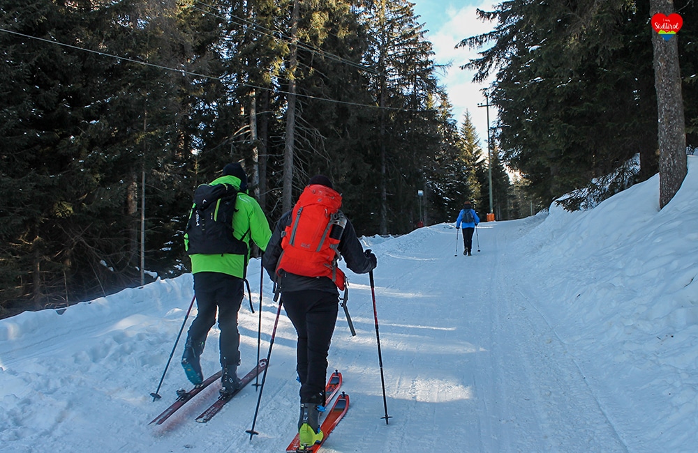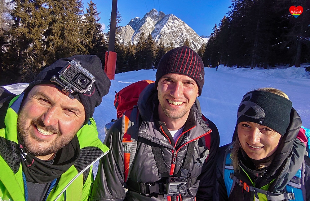 Nach einem genussvollen Frühstück sind meine Freundin Lucia mein Freund Armin und ich nach Falzeben bei Hafling gefahren. Angekommen am Parkplatz an der Seilbahn wurden wir vom Parkwächter freundlich empfangen. Während wir unsere Parkgebühren bezahlten, führten wir mit ihm ein informatives Gespräch über die möglichen Touren und den bewirtschafteten Almhütten. Als wir das Auto geparkt hatten, bereiteten wir uns vor: Skischuhe, Tourenski, Camaras, Drohne, usw. Nachdem wir startklar waren, nutzen wir noch kurz die öffentliche Toilette an der Talstation und marschierten los.
