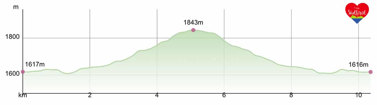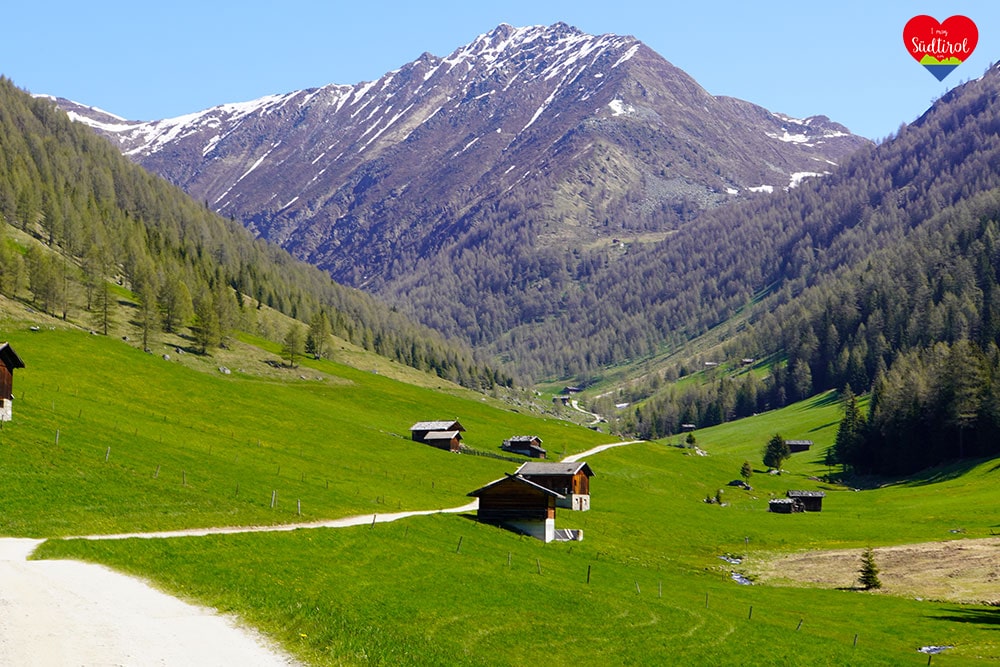 Das Altfasstal liegt oberhalb von Meransen zwischen Gitschberg und Jochtal. Hier finden wir einen herrlichen Almenweg der zum Wandern aber auch zum Radfahren sehr geeignet ist. Es geht sehr flach taleinwärts. Wir treffen halbwegs auch auf einen Kneipp-Parkour. Vor uns breiten sich dann große Almwiesen mit Futterhütten aus. Kühe und Pferde trifft man im Sommer viele. Der Talschluss wirkt wie ein runder Kessel durch Kurzkofel (2591m), Fensterlewand (2564), Nock(2528m) und Fallmetzer (2567m).