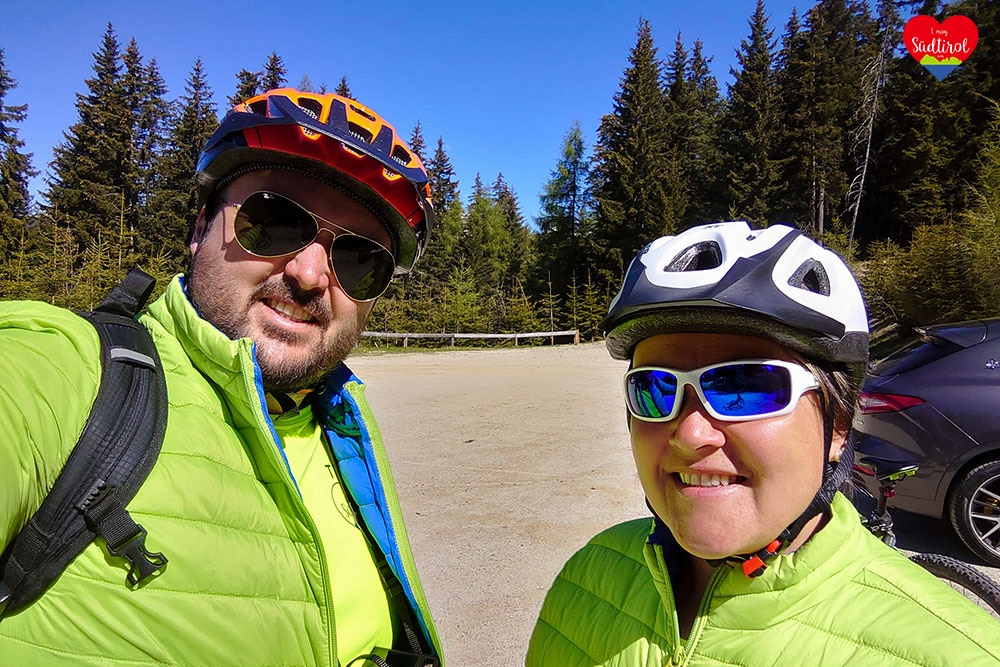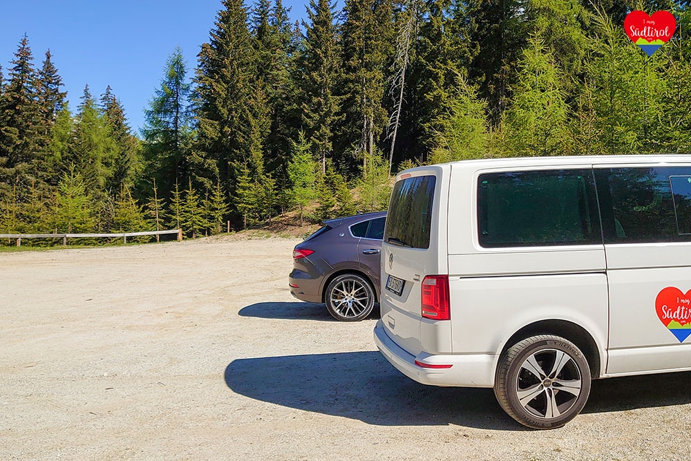 An einen sonnigen Tag bin ich von Brixen aus nach Mühlbach gefahren. Dort zweigte ich rechts ab und folgte der Straße bis nach Meransen. In Meransen angekommen, traf ich meine Schwester und wir sind zusammen zum Parkplatz Altfasstal inmitten des Waldes oberhalb des Dorfes gefahren. Am Parkplatz angekommen, parkten wir das Auto und bezahlten die Parkplatzgebühren. Ich hatte zum Glück Münzgeld mit, denn es gibt keinen Wechselautomaten. Ich bereitete unsere E-Bikes, Rucksack, Camara und Drohne vor.