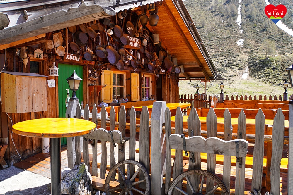 Kurz vor dem Talschluss hatten wir die Qual der Wahl. Die Wieserhütte oder die Pranter Stadlhütte luden mit Südtiroler Gerichten herzlich ein. Wir entschieden uns bei der Pranter Stadlhütte einzukehren. Ich machte einige Bilder und Aufnahmen mit der Drohne.