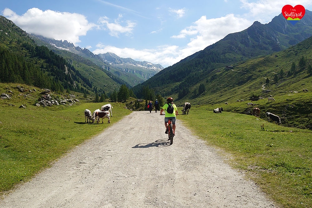 Am Talschluss von Prettau, kamen wir zum Parkplatz Kasern(Zahlungspflichtig). Dort stiegen wir aus, packten unsere Sachen, den Rucksack, die Kamera und die Drohne und bewunderten zuallererst den Rundumblick der herrlichen Bergwelt. In unmittelbarer Nähe sahen wir auch die Almsiedlung Hl. Geist auf über 1600 hm. Nun ging es talaufwärts. Immer wieder hörten wir die Glocken der weidenden Pusterer Prinzen, eine Kuh Rasse aus dem Pustertal. Wir hörten das laute Plätschern des Baches, der Ahr, die dort am Talende entspringt. Sehr gemütlich führte der breite Talweg zum Weiler Prastmann (1632m). Dort begann dann der Güterweg vorbei an der Adleralm (1680m) und weiter zur Kehreralm. Gehzeit etwa 2 Stunden. Immer wieder bewunderten wir die Blumen, die Alpenrosen, die Lichtnelken, den Hahnenfuß, den wilden Thymian oder den Breitwegerich.