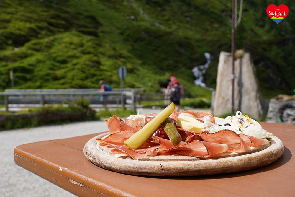 Angekommen in der Kehreralm bestaunten wir das enge steile Tal, aus der die Ahr als kleines Flüsslein fließt. Sehr freundlich wurden wir von Martina, der Kellnerin bedient. Die echte puschterer Bretteljause war für das Auge herrlich anzusehen und schmeckte sehr köstlich. Der selbstgebackene Apfelstrudel aus der Hand der Chefin, war ein Gedicht. Kurz vor dem Abschied machten wir noch die Bilder mit der Kamera und der Drohne und tranken noch zusammen ein Stamperl herrlichen „Nusseler“.