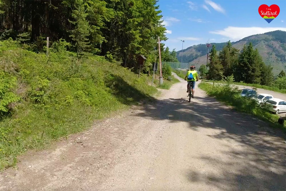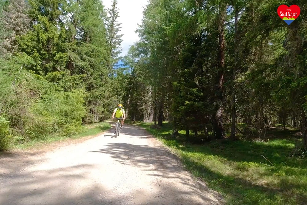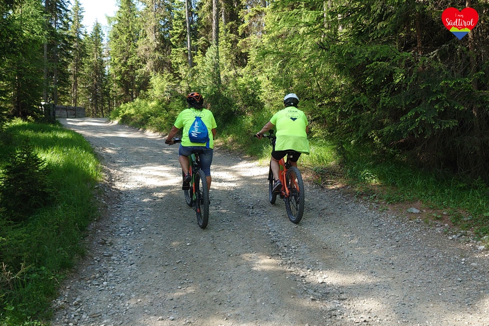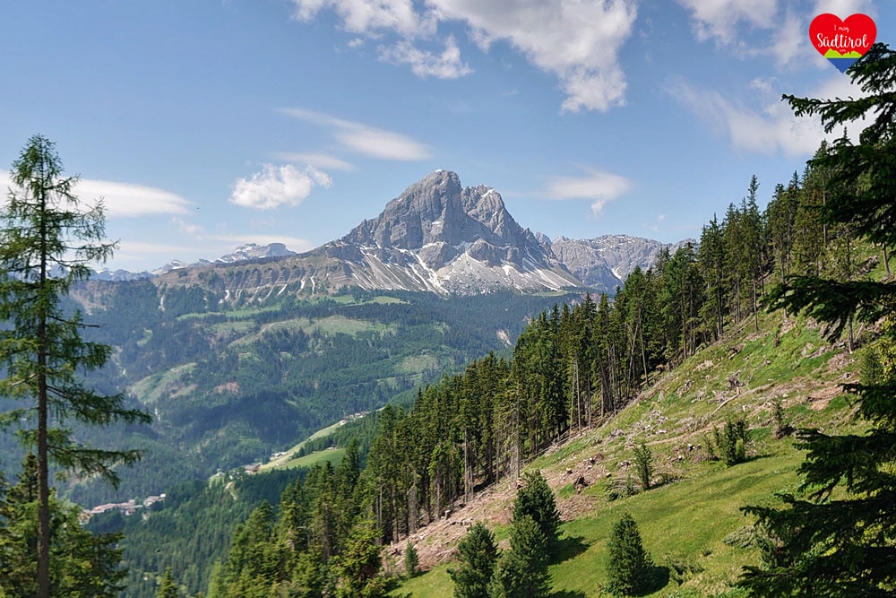 Ich lud unsere Räder ab, packte mein Drohne und die Kamera in den Rucksack und dann radelten wir los. Wir fuhren den Wanderwaldweg entlang. Er führte uns in Serpentinen etwas steil zwischen den Nadelbäumen durch. Plötzlich verzauberte uns ein Blick. Links von uns stand majestätisch der Peitler Kofel. Immer wieder warfen wir, wenn wir auch treteten, einen Blick zum Berg hinauf. Nach einer guten halben Stunde sahen wir die Alm: Munt da Rina.
