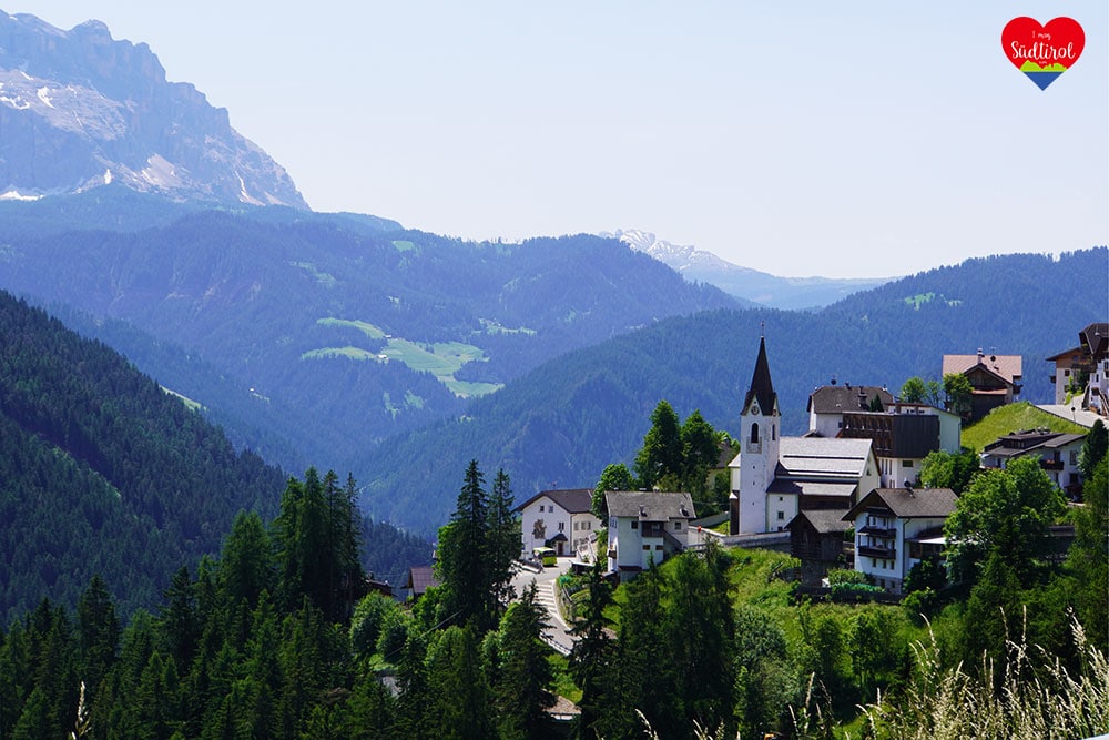 An einem sonnigen Sommertag lud ich kurz entschlossen meine Schwester Karin und Ruth, eine Bekannte, zu einer Radtour ein. Ich stellte drei Räder ins Auto, nahm den Rucksack und holte beide Frauen ab. Wohin sollte es gehen? Ich fuhr Richtung Pustertal. In diesem breiten, grünen, herrlichen Tal gibt es unzählig viele Möglichkeiten. Kurz vor St. Lorenzen kam mir die Idee, ins Gadertal abzubiegen. Wir fuhren entlang der Gader bis zur Abzweigung nach Welschellen. Die steilen Hänge neben der Auffahrt zum Dorf beeindruckten uns sehr. Am Dorfende fuhren wir rechts weiter bis zu einem Sportplatz. Da war der Parkplatz. Wir parkten das Auto, stiegen aus und sahen uns um. Welch ein herrlicher Blick auf Antermoia und Furkelpass.