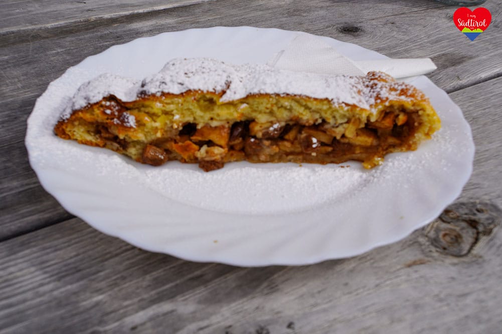 Angekommen auf der Ochsenalm wurden wir zunächst freundlich empfangen und wir setzten uns auf die schöne Terrasse mit zahlreichen Holzbänken. Wir waren früh auf Wanderschaft und somit die ersten Gäste. Die Almhütte schaute mit steinernen Mauern und der Holzverkleidung richtig urig aus. Wir fühlten uns wohl und bestellten ein Café und Apfelstrudel, um uns zu stärken und zu belohnen. Es schmeckte super. Von der Terrasse aus hatte man einen Weitblick auf das ganze Tal. Im Norden zu den Ortschaften Spinges und Meransen, im Talkessel die Stadt Brixen, die Ortschaft Vahrn, Pinzagen Tschötsch, Tils, Feldthurns, und die Sarntaler Alpen mit Königanger Spitze. Traumhaft.