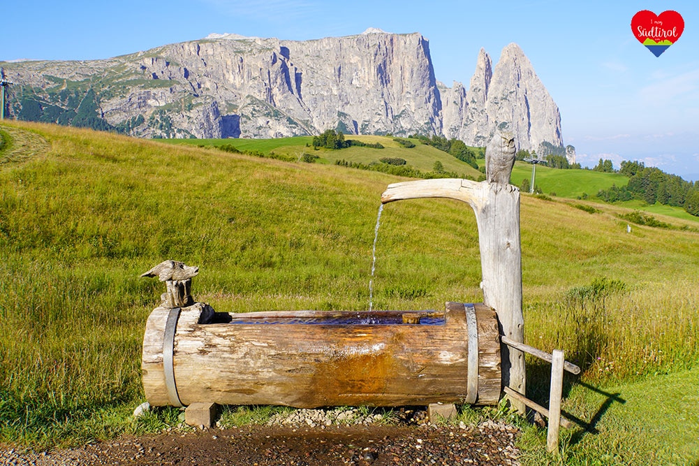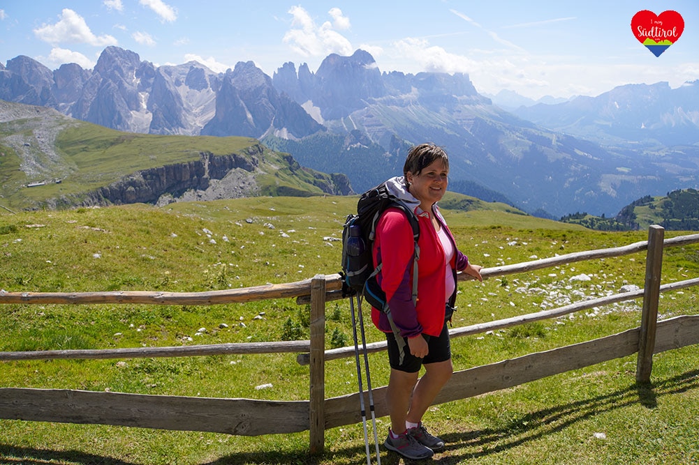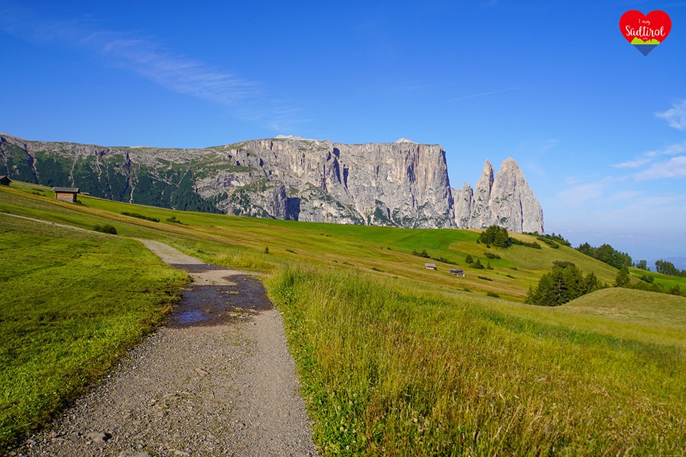 Nach kurzer Vorbereitung und Toilettenpause starteten wir los. Über die Treppen verließen wir die Bahnanlage und gingen rechts vorbei an einigen Geschäften und Einkehrmöglichkeiten über die Teerstraße bis zum großen Parkplatz. Am Infopoint bogen wir rechts ab und folgten der Beschilderung Nr. 10 Schlernhaus (3h 10m). Zunächst wanderten wir über die Teerstraße knapp 500m bis zu einer Abzweigung. Nach einigen Minuten bogen wir rechts ab und marschierten über den Schotterweg mit angenehmer Steigung in Richtung Spitzbühl. Saftige Almwiesen, private Almhütten, der Duft nach frisch gemähtem Gras sowie der herrliche Blick auf das vor uns liegenden Schlern Massiv waren einmalig schön. Immer wieder machten wir großartige Bilder. Wir kamen zu einer Abzweigung, wo ein breiter Forstweg unseren Weg kreuzte. Wir wanderten gerade aus auf den vor uns liegenden schmaleren Feldweg leicht abwärts. Anschließend folgten wir (links) dem Forstweg, vorbei an der Gstatsch Schwaige (Einkehrmöglichkeit) zur Saltnerhütte (Einkehrmöglichkeit) bis hin zu einem kleinen Bachbette. Nach Überquerung folgten wir nun den Wanderweg mit mäßiger Steigung, vorbei an Almwiesen durch den Wald über Stock und Stein. Schritt für Schritt marschierten wir den Berg hinauf. Im oberen Bereich säumten Latschenkiefer, saftige Almwiesen und Bergblumen den Wanderweg und wir hatten einen herrlichen Blick auf die gesamte Seiseralm, Puflatsch Lang- und Plattkofel. Schließlich erreichten wir den Bergrücken des Schlern. Das letzte Teilstück bis zum Schlernhaus war nun etwas flacher und angenehmer.
