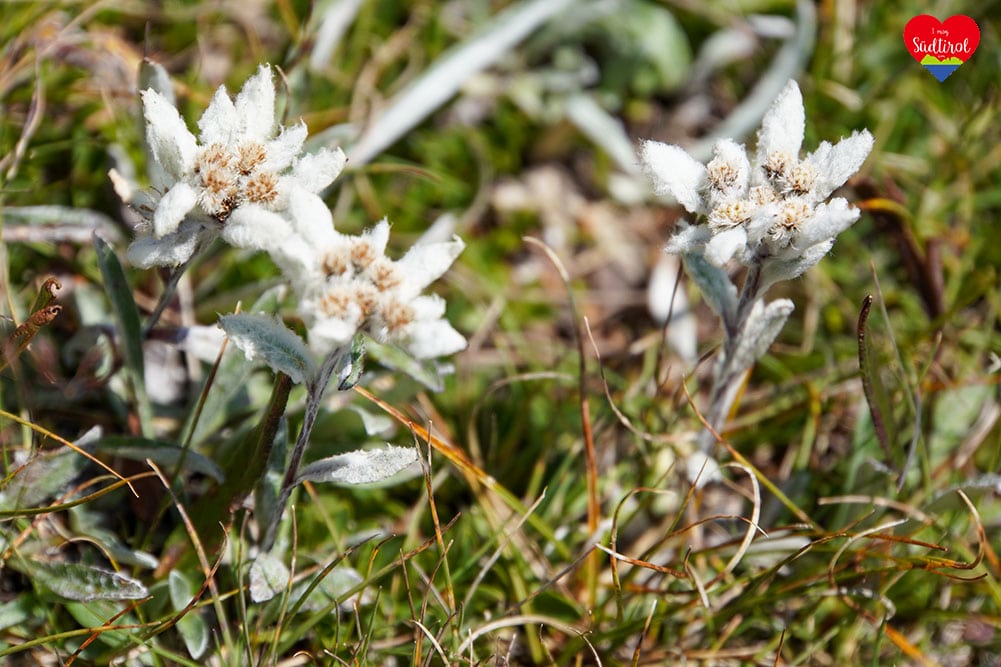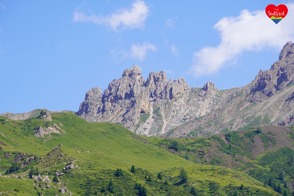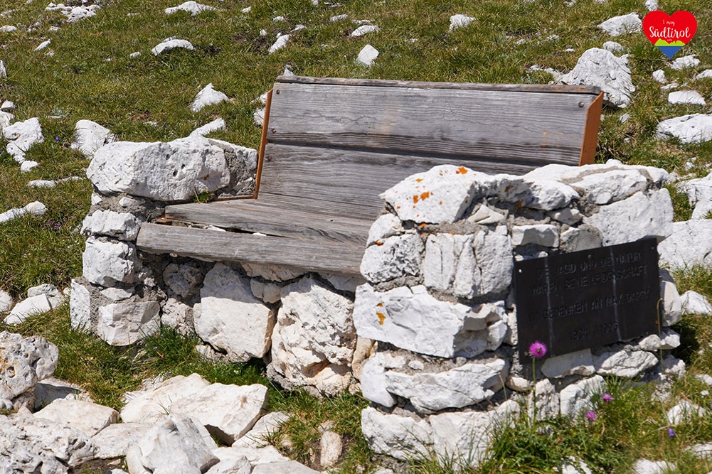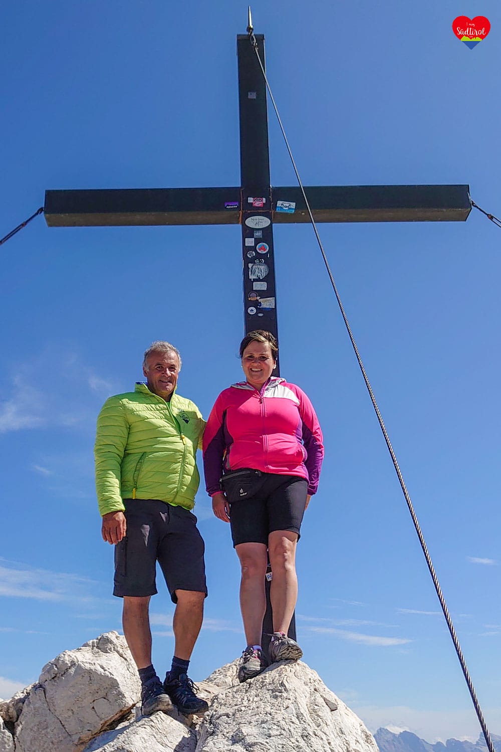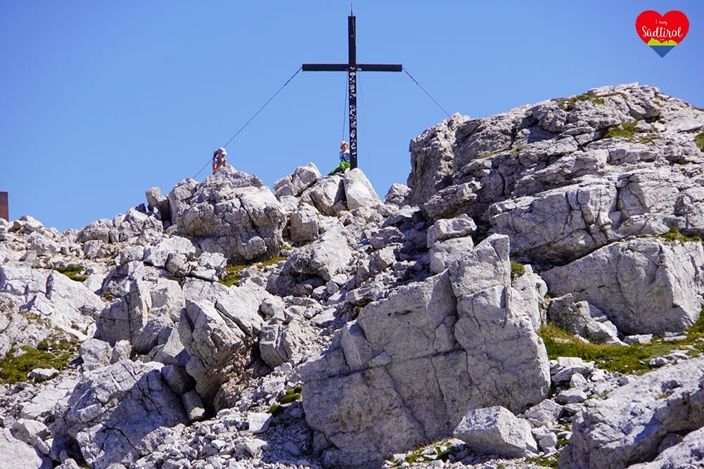 Frisch gestärkt wanderten wir nun durch ein Holztor. Der steinige Weg verlief anfangs mit mäßiger Steigung und in der Nähe des Weges erblickten wir eine Vielzahl an Edelweiß. Es war wunderschön. Der letzte Teil bis zum Monte Petz Gipfel wurde etwas anspruchsvoller, aber wir schafften die 20-minütige Wanderung bis zum Gipfel ohne Probleme. Wir machten Bilder und Videos und bestaunten die umliegende Bergwelt: Rosengarten, Lang- und Plattkofel, die Rosszähne und viele mehr. Es war traumhaft schön