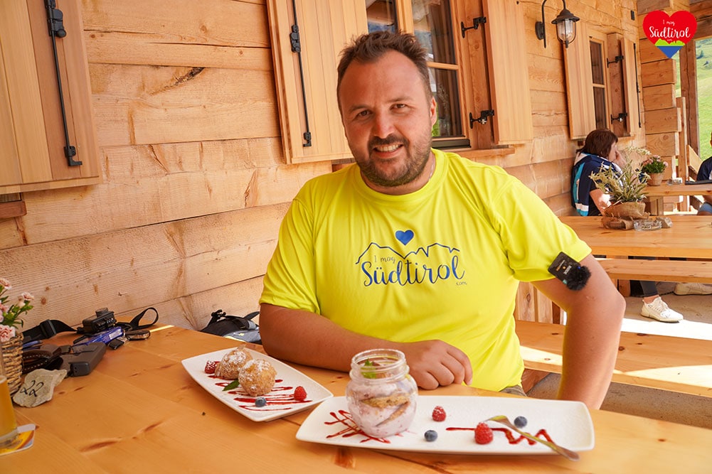 Zunächst wanderten wir wieder zum Schlernhaus zurück, von dort über den Bergrücken des Schlerns, bis zum etwas anspruchsvolleren Teil. Zick Zack gingen wir den Weg entlang hinunter, den wir gekommen waren. Schließlich kamen wir wieder zur Saltnerhütte (Einkehrmöglichkeit). Hier wurde der Weg etwas breiter und wir wanderten noch gut 500 Meter bis zur Gstatsch Schwaige. Dort kehrten wir ein und saßen herrlich auf der Sonnenterasse. Der Nachbartisch bekam süße Nougat Knödel. Ohne zu überlegen, bestellten auch wir sie auch. Ebenso eine kleine Überraschung im Glas. Genuss pur!