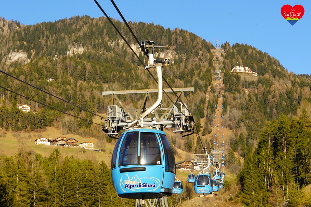 Angekommen am Parkplatz (keine Parkplatzgebühren) kauften wir eine Bahnkarte. an der Talstation und setzten uns in die 10er Gondel. Wir waren die ersten Gäste, denn es war noch nicht so viel los. Die Bahn startete und los gings. Während die Bahn immer mehr an Höhe gewann, hatten wir eine grandiose Aussicht. Das Dorf Seis mit den umliegenden Bauernhöfen, die saftigen Almwiesen und das Schlern Massiv. Nach Rund 4 km, 800 hm sowie einer Fahrzeit von ca. 15 min erreichten wir die Bergstation und waren nun auf der Seiser Alm / Compatsch angekommen.
