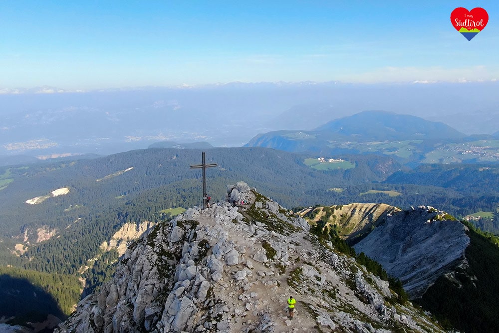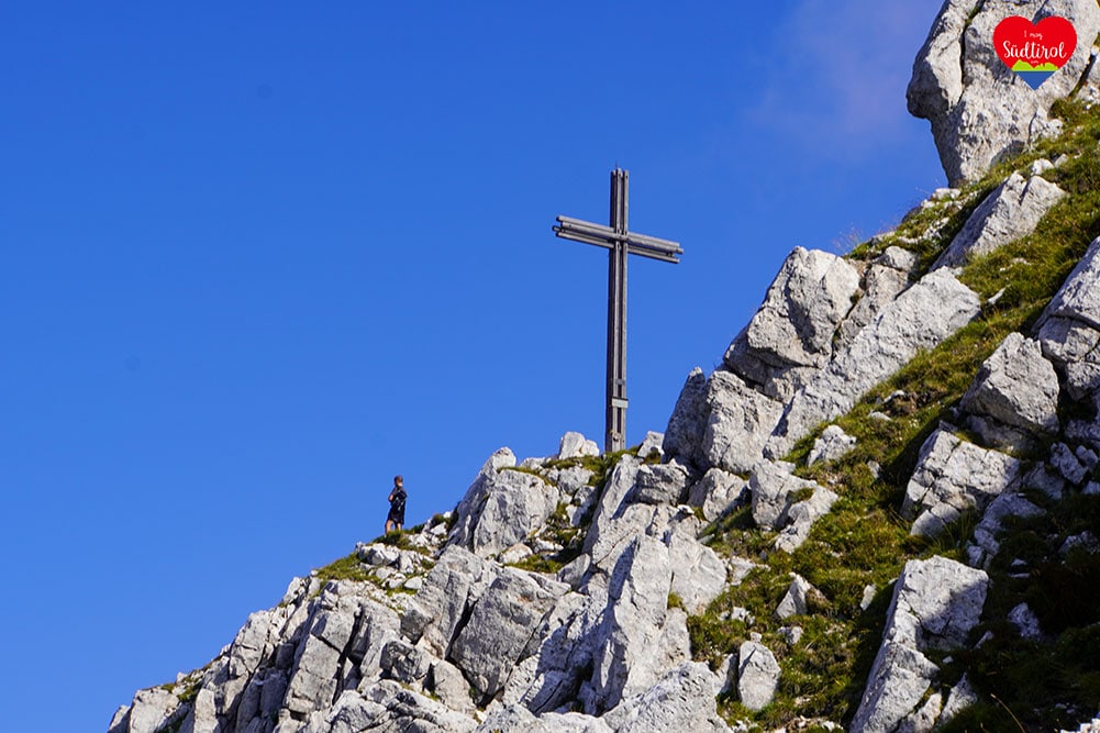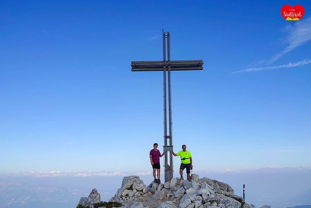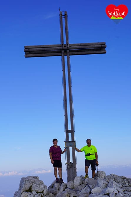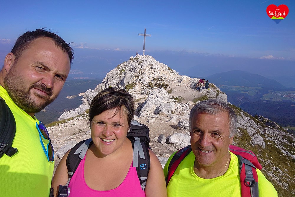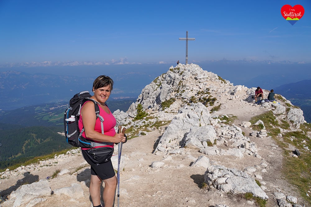 Angekommen am Gipfel auf 2317m, gingen wir gleich zum Gipfelkreuz. Es war wunderschön. 360 Grad Rundumblick auf das daneben liegende Schwarzhorn 2439m, Pala di Santa (2493m) den Fleimstaler Alpen, den Pilgerort Maria Weissenstein oder die Ortschaft Deutschnofen . Wir genossen die Aussicht und machten Rast.