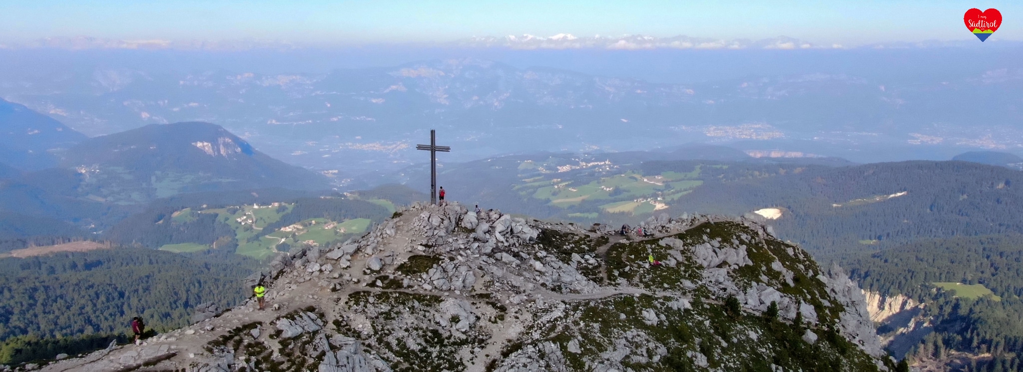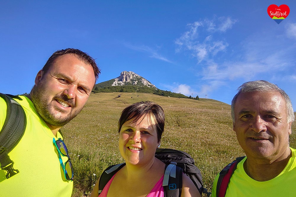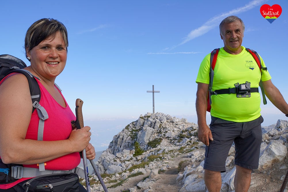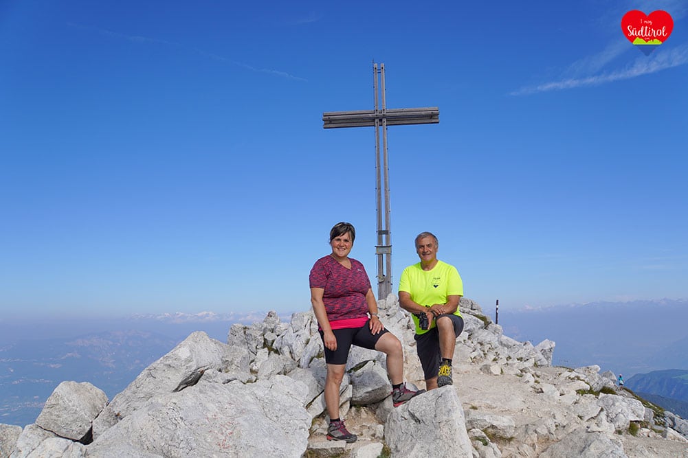 Angekommen am Gipfel auf 2317m, gingen wir gleich zum Gipfelkreuz. Es war wunderschön. 360 Grad Rundumblick auf das daneben liegende Schwarzhorn 2439m, Pala di Santa (2493m) den Fleimstaler Alpen, den Pilgerort Maria Weissenstein oder die Ortschaft Deutschnofen . Wir genossen die Aussicht und machten Rast.
