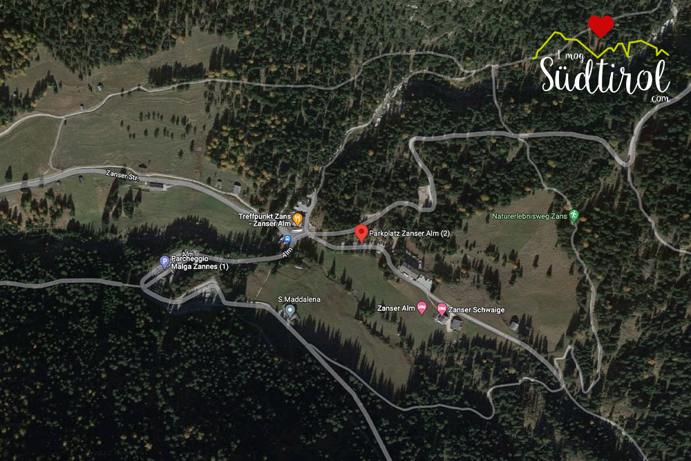 In der Hochsaison kann auch passieren das die Ampel auf Rot geschaltet ist und man nicht mehr hochfahren darf bis zur Zanser Alm. Somit parkt man sein Auto in St. Magdalen und fährt die 5,5km man mit dem Linienbus bis zur Zanser Alm.