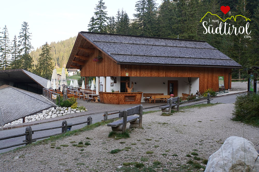 Zunächst machten wir die ersten Bilder. An der Info Zans, eine bewirtschaftete Almhütte, machten wir kurz eine Pause (WC) und tranken einen Espresso. Gegenüber war eine große Tafel mit Wanderwegen sowie schönen Bänken. Hier suchten wir unsere Tour aus und besprachen sie auch. Schließlich starteten wir über den Wanderweg Nr. 6 los.