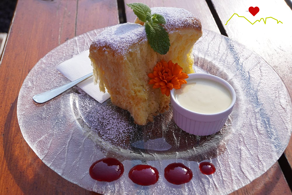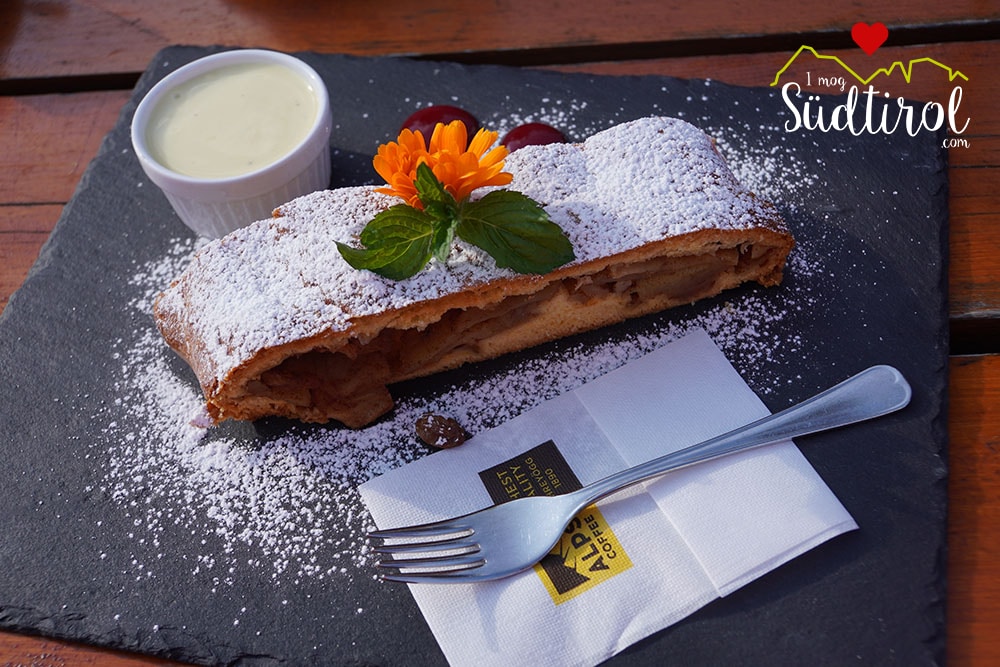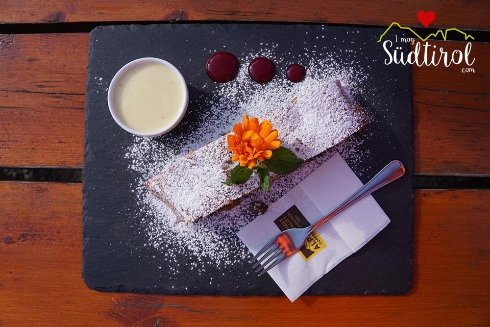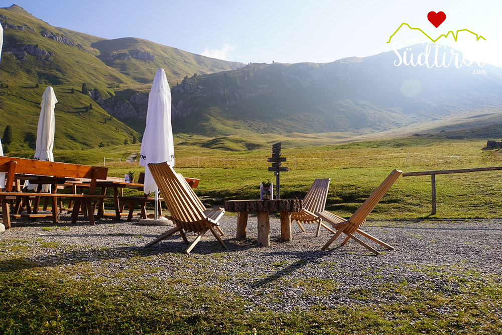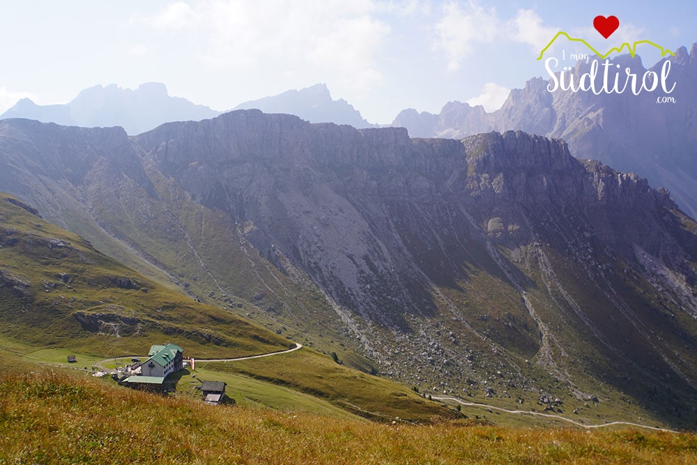 Wir setzten uns gleich auf die Sonnenterrasse und genossen das herrliche Wetter. Wir genossen einen Cappuccino und hausgemachte „Buchteln“, eine Spezialität der Hütte. Mit dem Hüttenwirt plauderten wir über das Villnösser Brillenschaf. Nach der Stärkung folgten wir dem schmalen Wanderweg oberhalb der Hütte und sahen bereits in der ferne unser Wanderziel, den Zendleser Kofel.