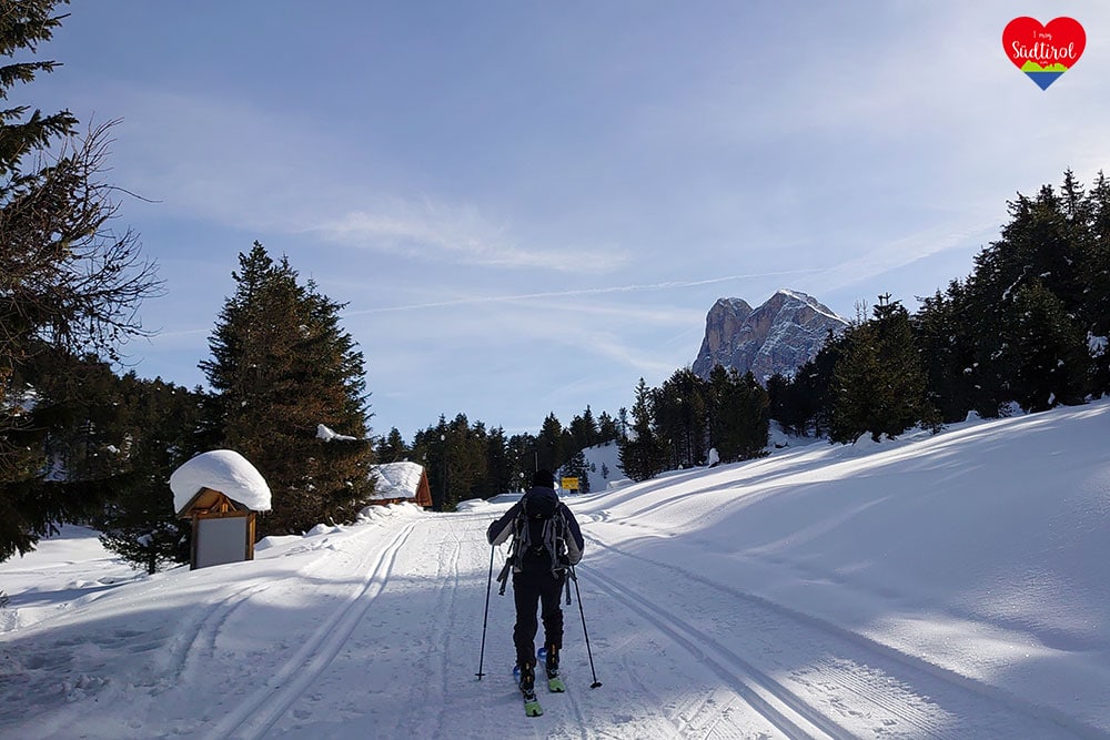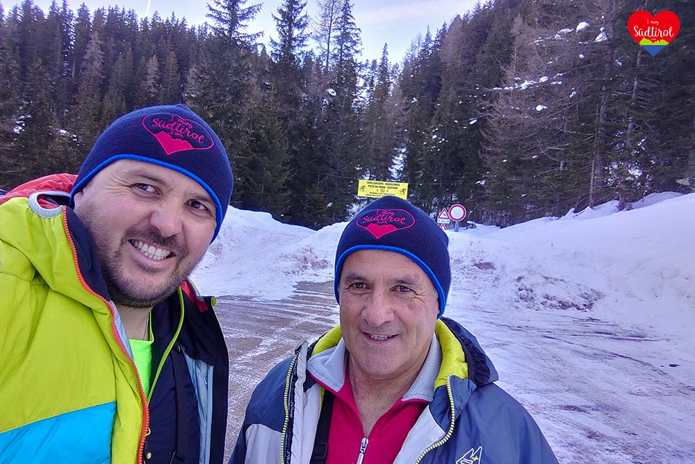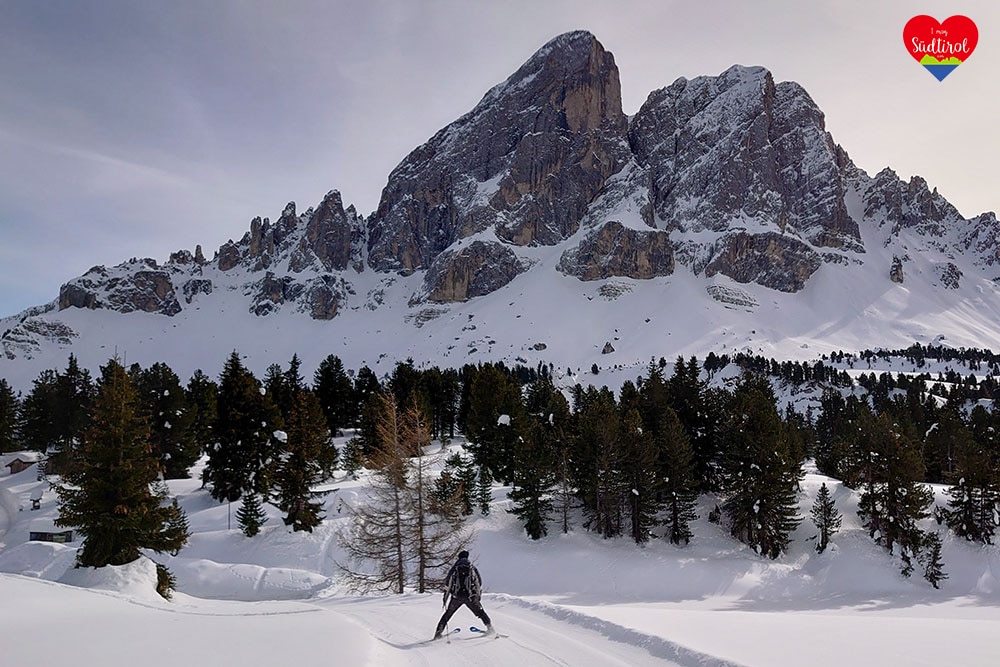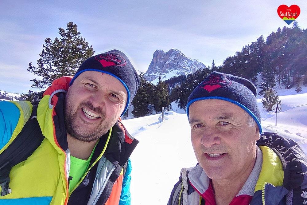 Nach der Stärkung marschierten wir weiter. Dabei sichteten wir verschiedene tiefverschneite Almen und den Peitlerkofel der selten mit so viel Schnee bedeckt war. Nach kurzer Zeit war ein Teilstück etwas flacher beziehungsweise ging es leicht abwärts. Wir wussten nicht genau sollen wir die Bindung zu machen oder nicht und versuchten unser Glück mit geschlossener Bindung. Wir kamen dem Peitlerkofel immer näher. Ab der Kreuzung, wo man im Sommer von der Ortschaft Lüsen aufs Würzjoch fahren kann, ging der Weg wieder aufwärts mit mehr Steigung. Schließlich ging es Kurve für Kurve aufs Würzjoch, Oben angekommen machten wir n Stopp bei der „Ütia de Börz“. Der Blick auf den Peitler Kofel, den Tullen und die Aferer Geisler war einmalig. Ich machte Bilder und Aufnahmen und wir stärkten uns.