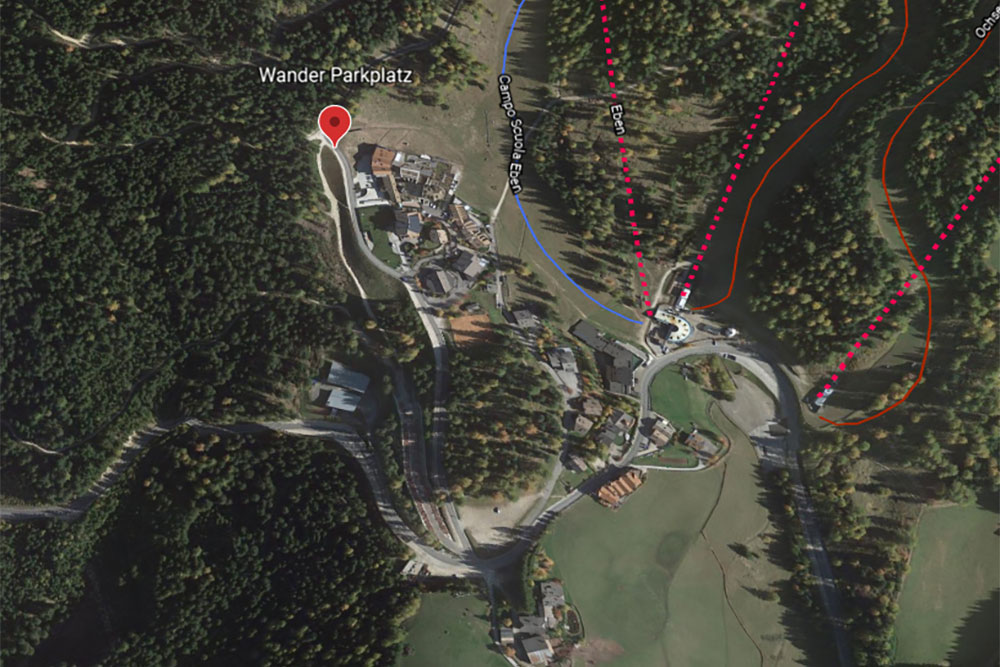 An einem sonnigen und wolkenlosen Tag sind mein Vater, meine Schwester und ich über die Brenner Autobahn Richtung Bozen gefahren. In Bozen Nord verließen wir sie, bogen rechts ab und folgten der SS12 rund 1km. Dann zweigten wir rechts ab und fuhren zum Kreisverkehr. Hier folgten wir der Staatstraße SS241 sowie der Beschilderung Obereggen bis nach Birchabruck. Nun ging es nach rechts und wir fuhren auf der Provinzstraße bis nach Obereggen. An der Talstation des Skigebiets machten wir kurz Stopp (WC Pause). Dann fuhren wir wenige Meter weiter, am großen Parkplatz (Wanderparkplatz) vorbei bis oberhalb des Hotels Zirm, wo die Straße zu Ende war. Dort parkten wir unser Auto.