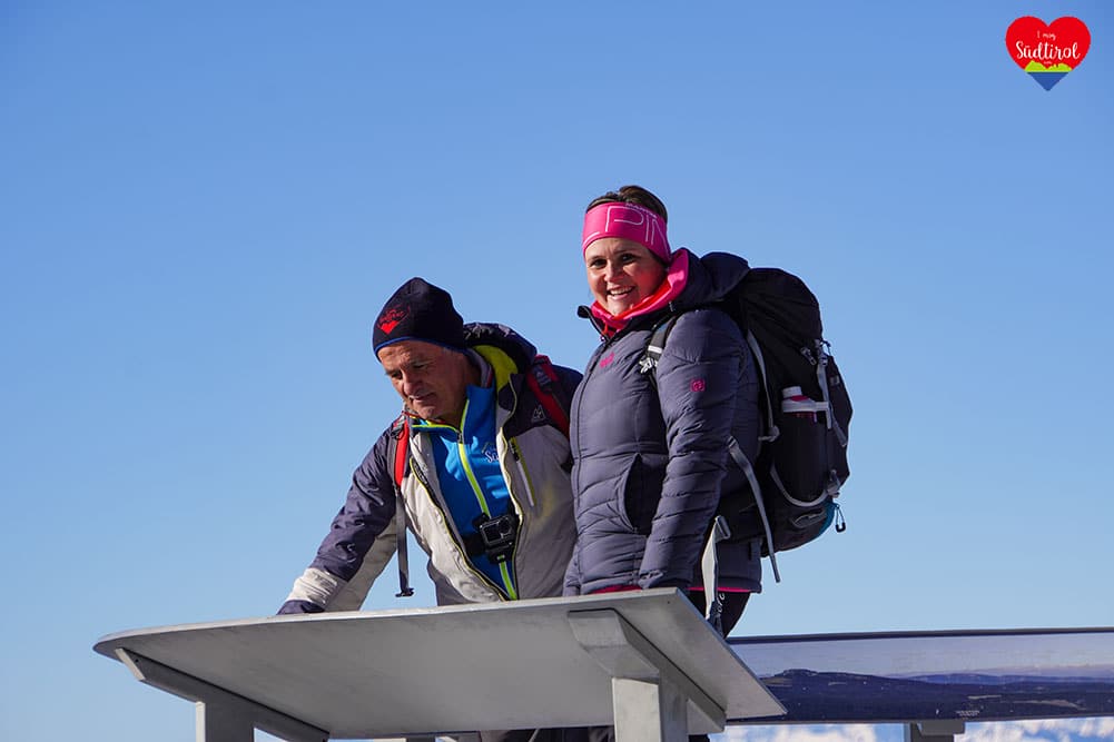 Nach der Stärkung folgten wir wenige Minuten den schmalen Wanderweg oberhalb der Oberholz Berghütte bis zur Aussichtsplattform Oberholz. Hier stellte man eine Runde Plattform aus Holz mit beschrifteten Tafeln auf, auf denen die umliegende Bergwelt erklärt wurde. Wir staunten über die herrlichen Berge, wie: den Zanggen (2.488m), das Weißhorn (2.316m), das Schwarzhorn (2.439m) oder den Latermar (2.842m) unter dem wir uns gerade befanden. Wir machten Bilder und Videos und ließen die Aussicht auf uns wirken.