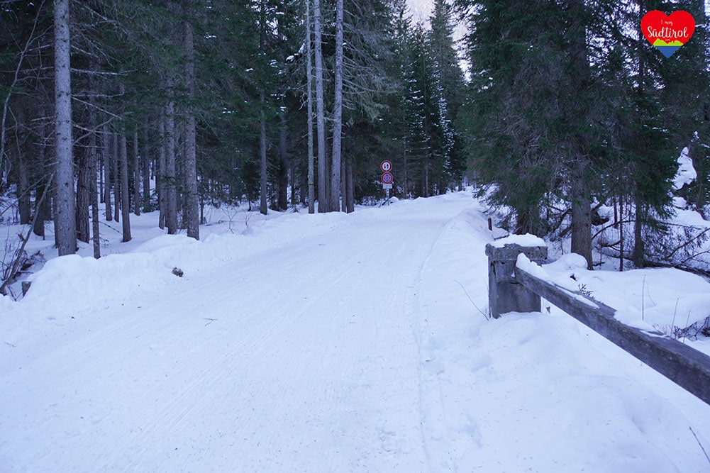Hier parkten wir unser Auto. Wir waren frühzeitig unterwegs und es waren kaum andere Fahrzeuge. Es war tiefster Winter denn es hatte erst vor wenigen Tagen 30 cm Neuschnee geschneit. Wir nahmen den Rucksack sowie die Rodeln und marschierten los. Es ging über eine Holzbrücke, auf der präparierte Winterstraße, taleinwärts durch den herrlichen Winterwald.