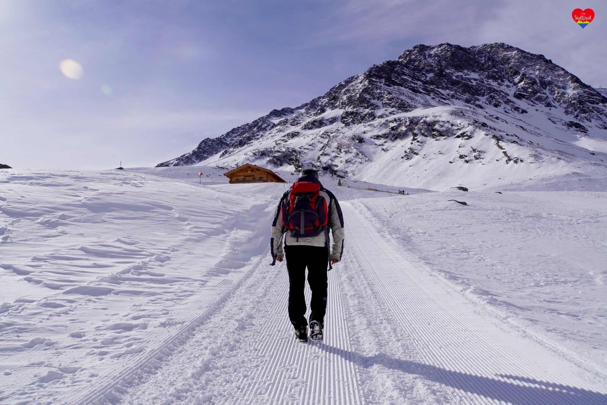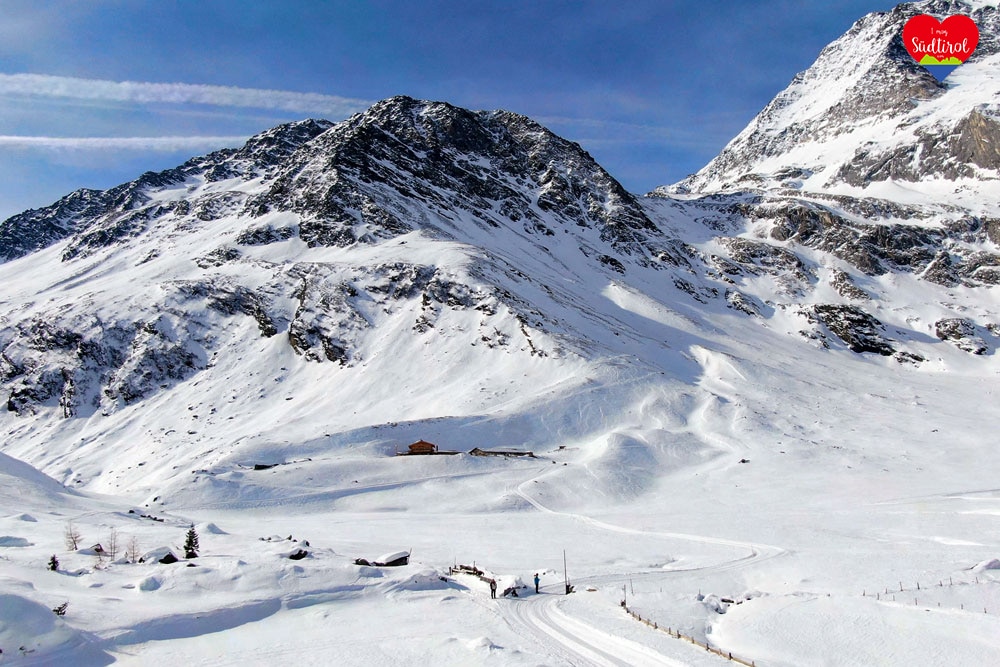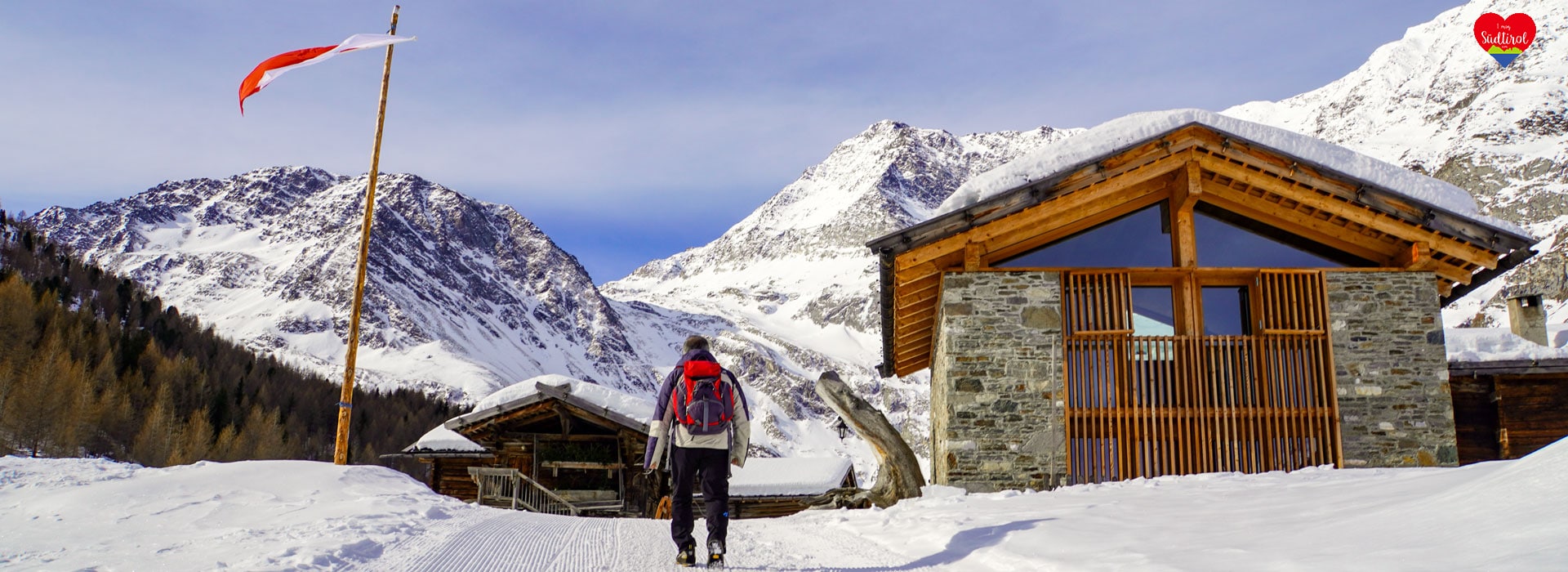 Ein Wintertraum! Die Lazinser Alm finden wir im Pfelderer Talschluss, im Naturpark der Texelgruppe, am Fuße der Hochwilde auf 1858m. Die von Pfelders in Passeiertal erreichbare Hütte liegt zwischen dem Pfelderer Tal und dem Pfossental in Südtirol. Rund um diese Alm gibt es ebene Wiesen mit sehr viel Schnee. Dies ist eine angenehme Wanderung in einer herrlichen Winterlandschaft, die geeignet für Familien mit Kindern ist.