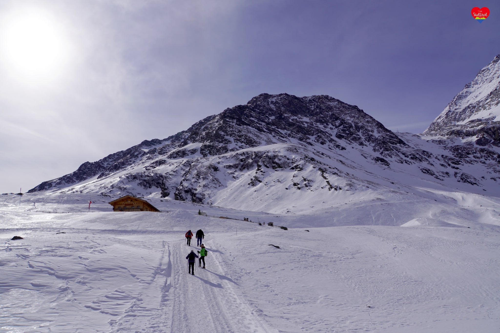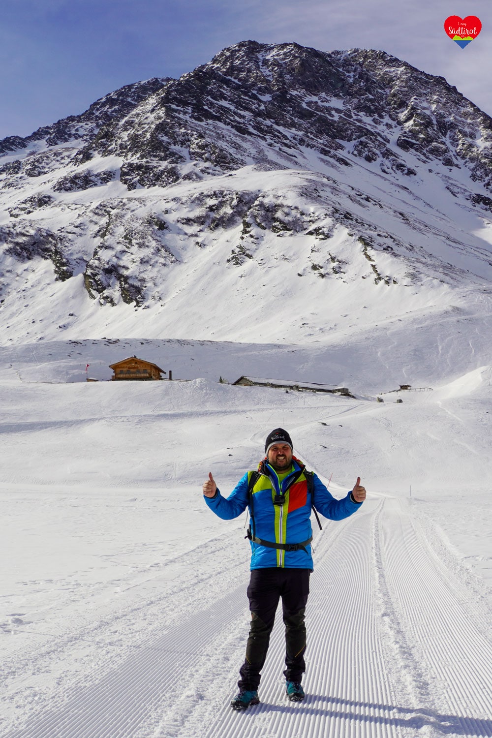 Schließlich war es so weit. Wir bereiteten uns für die Rückwanderung vor. Wir verabschiedeten uns beim Hütten Team, bedankten uns und marschierten los. Einige Wanderer kamen uns entgegen und grüßten freundlich. Wir machten letzte Bilder und wanderten über den großartigen Winterwanderweg zurück zur nach Pfelders. Beim Auto angekommen, freuten uns über den außergewöhnlich schönen Tag. Eines war sicher: wir kommen wieder. Nun packten wir alles ins Auto und machten uns auf dem Heimweg.