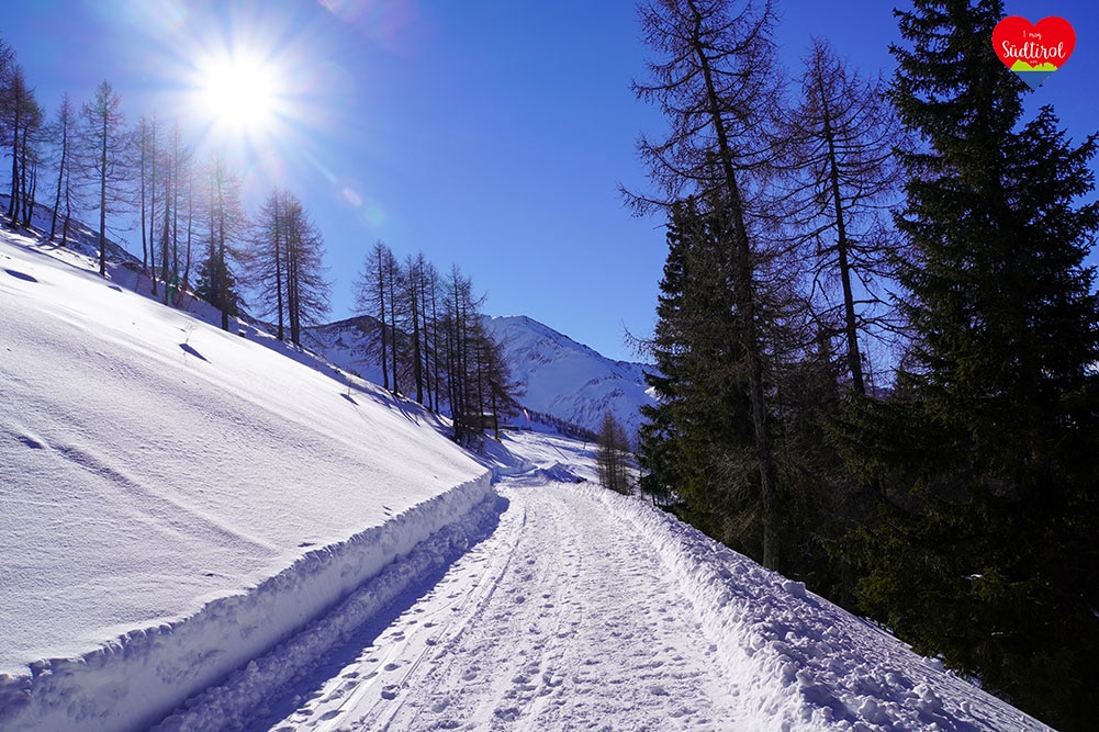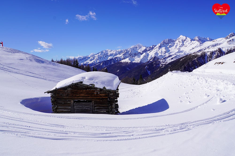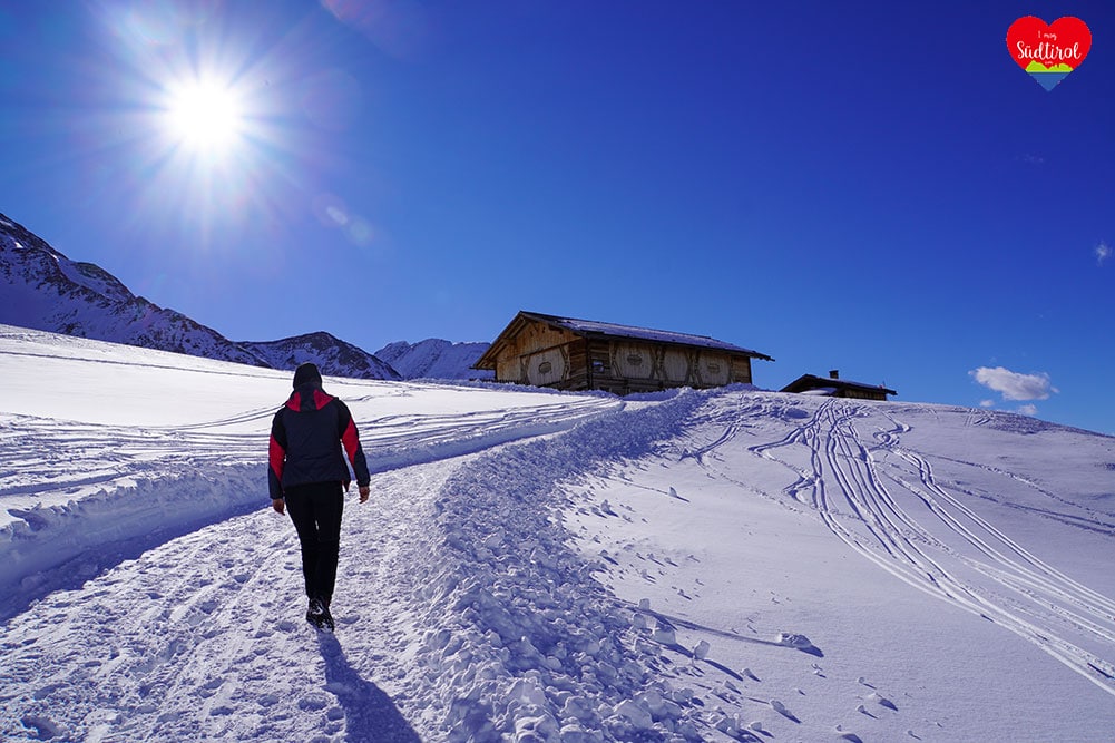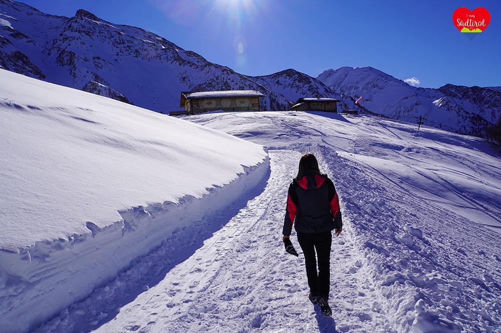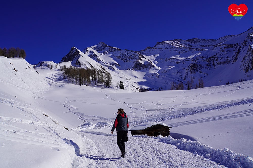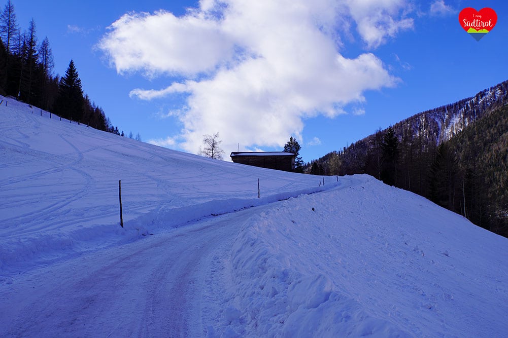 Eine leichtere Winterwanderung ist die 3,2km lange Tour zur Knutten Alm bei Rein in Taufers. Mit 220hm und einer Gehzeit ca. 1h bis zur Hütte, ist diese Wanderung auch für Familien geeignet. (Gesamt 6,4km, Geheiz 2h)