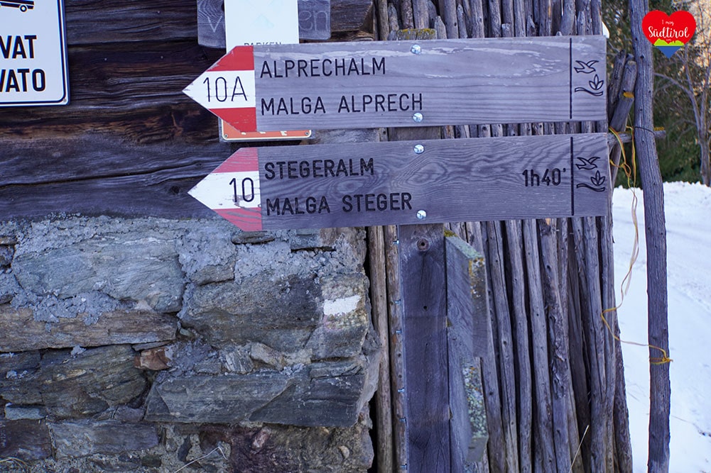 Wir folgten der Beschilderung Nr10 / Stergeralm und wanderten am Hof vorbei, entlang der verschneiten Almwiesen mit schönem Blick auf das Bergdorf Prettau, in den Wald hinein. Der verschneite Winterwanderweg wurde nun etwas steiler und wir folgten eine Zeit lang diesem Weg. Er war in perfekten Zustand und bestens präpariert. Mehrerer Wanderer und Skitourengeher begegneten uns. Der Winterwanderweg schlängelte sich nun den Berg hinauf. Oberhalb der Baumgrenze kamen wir zu einer Lichtung und plötzlich sahen wir die Stegeralm vor uns