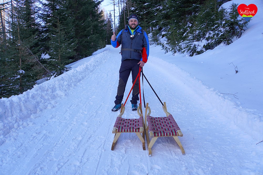 Nein, für dieses Vergnügen auf dem verschneiten Weg gibt es keine Rodeln zum Verleihen